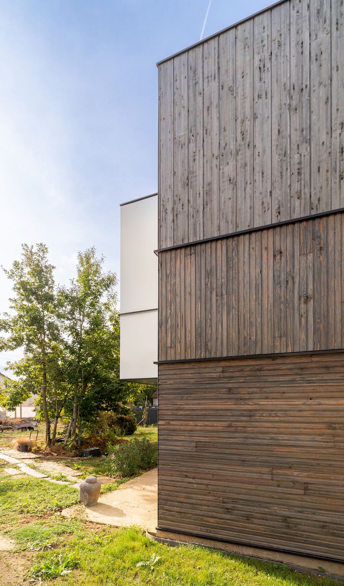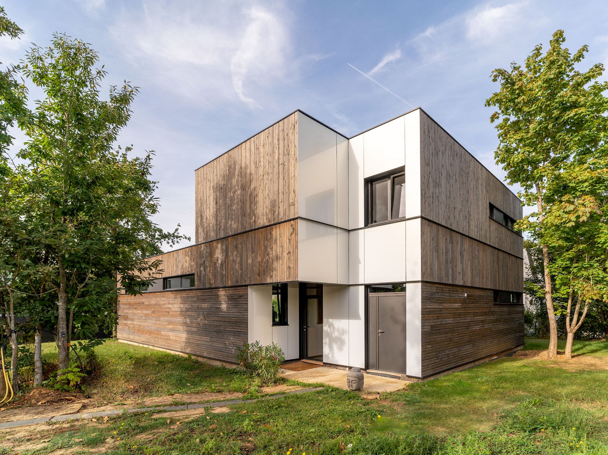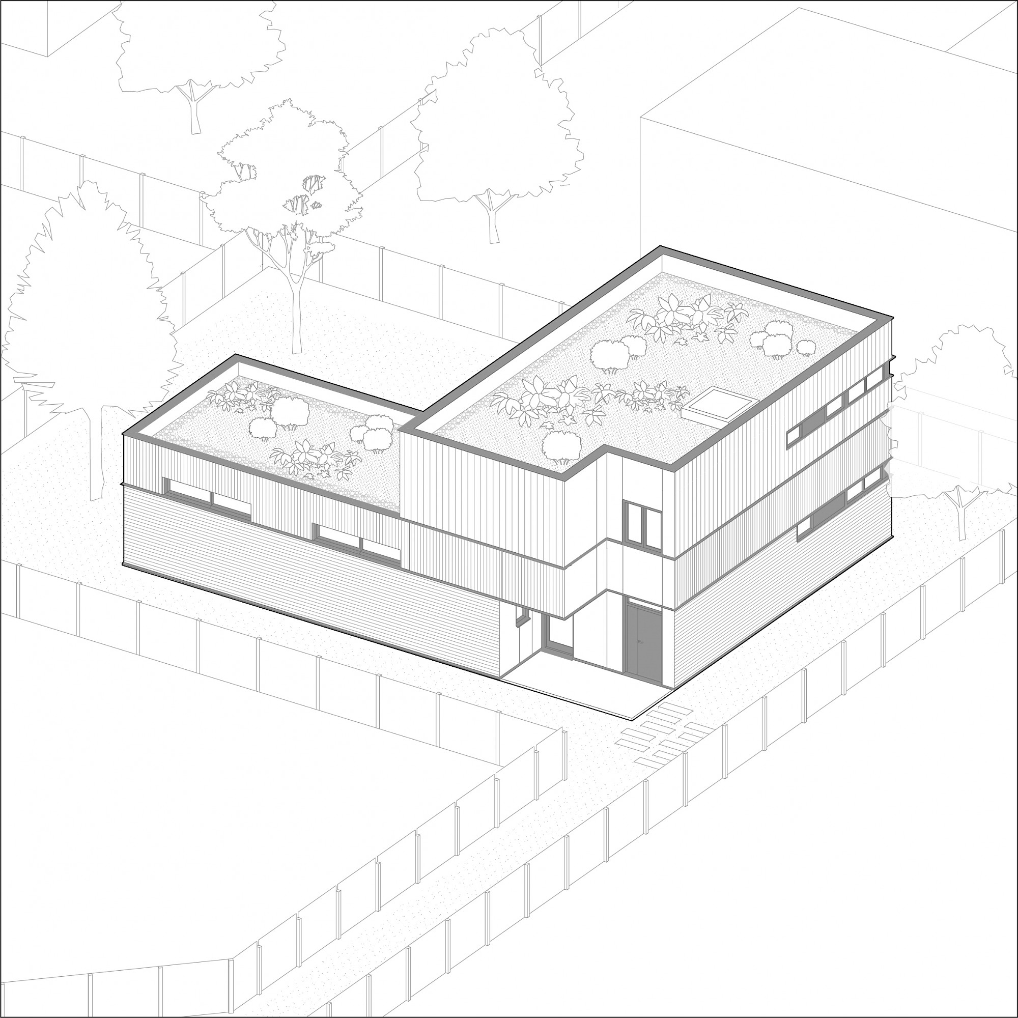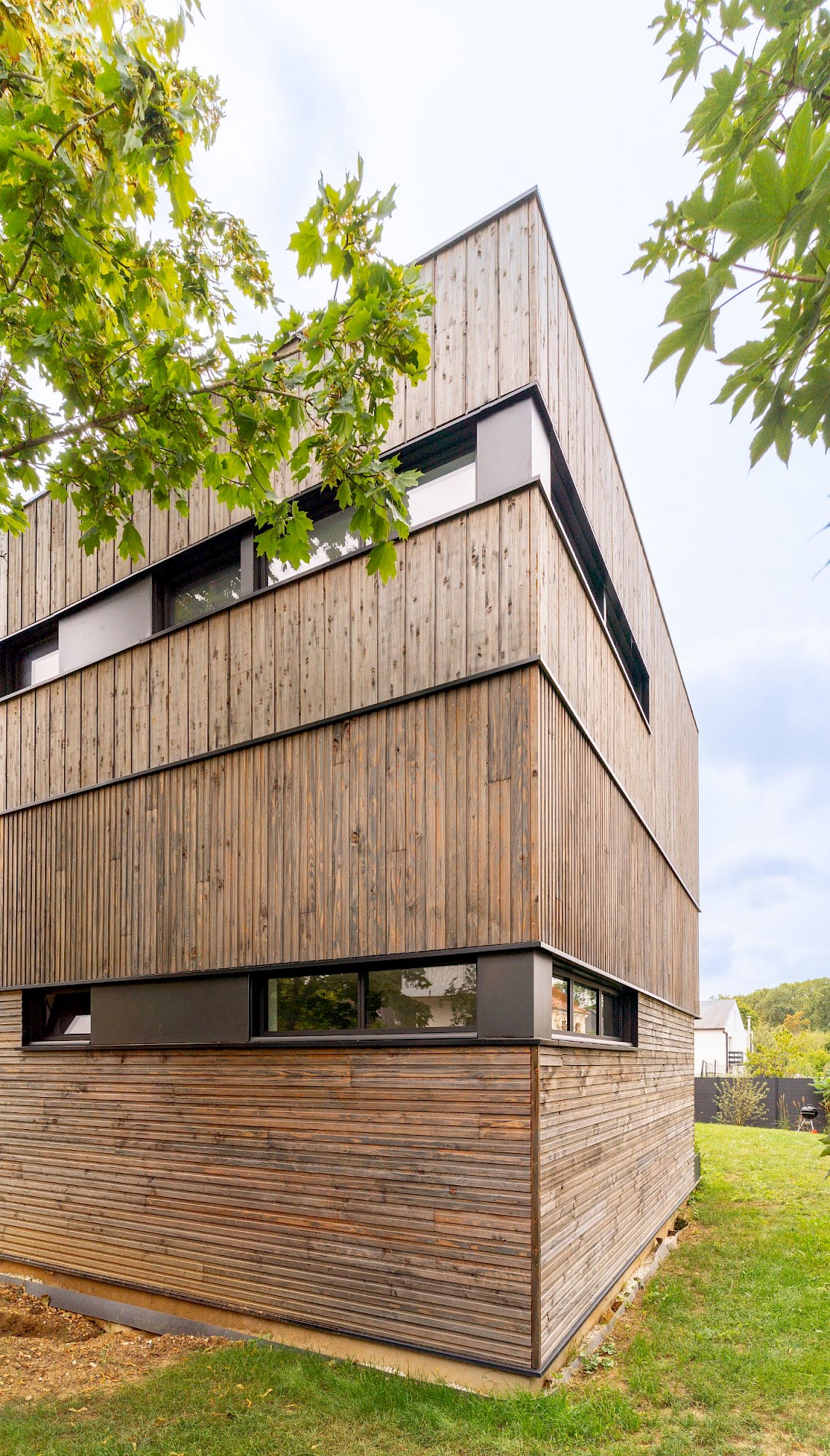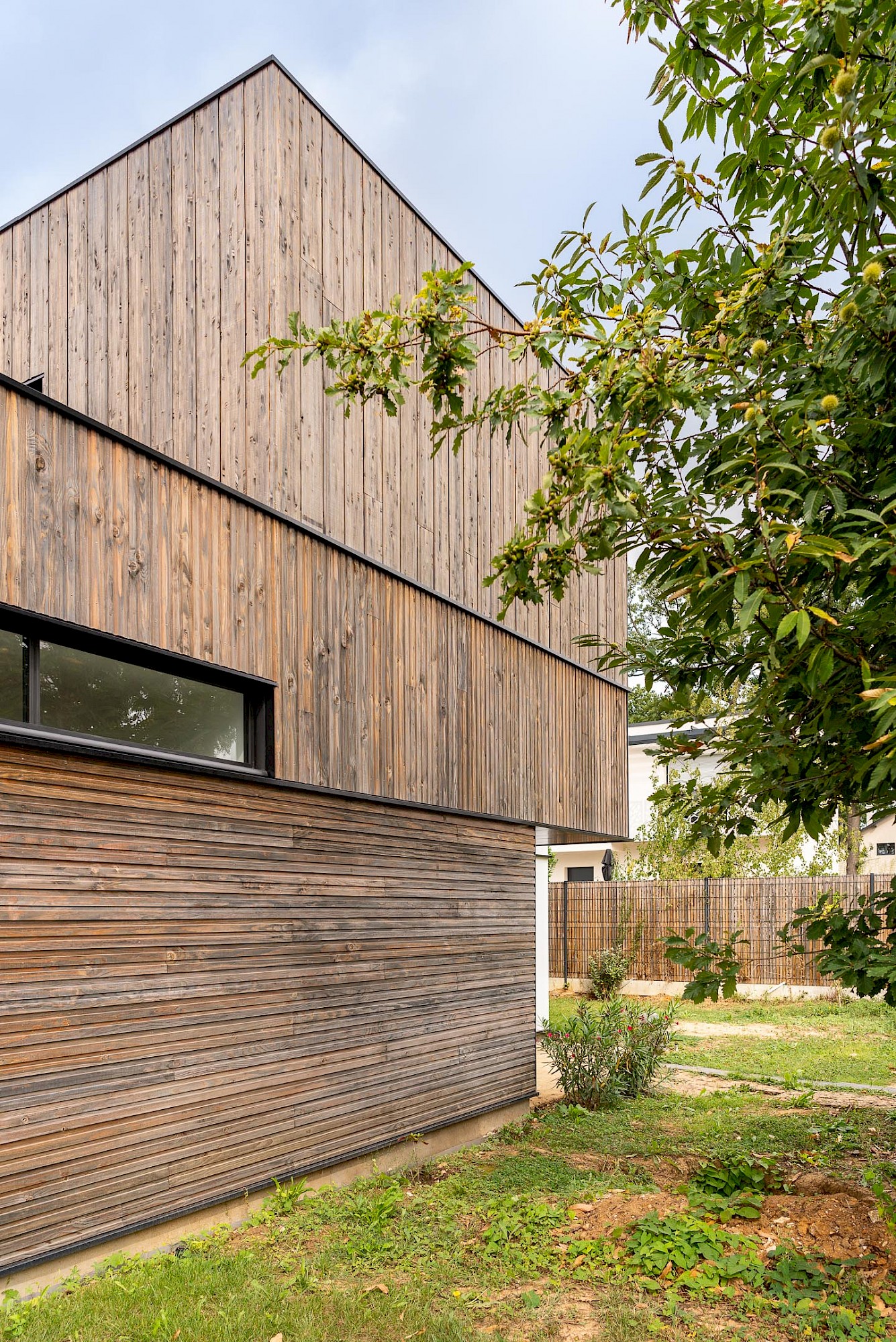 - À proposSur un terrain vierge de tous réseau, projet d’allotissement de deux terrains et construction d’une maison neuve en structure bois à toitures végétalisées, sur une dalle maçonnée. La nature argileuse des sols a impliqué une grande précaution dans la gestion des eaux pluviales pour limiter le phénomène de gonflement et de retrait du sol qui aurait pu mettre en péril les fondations de la maison..