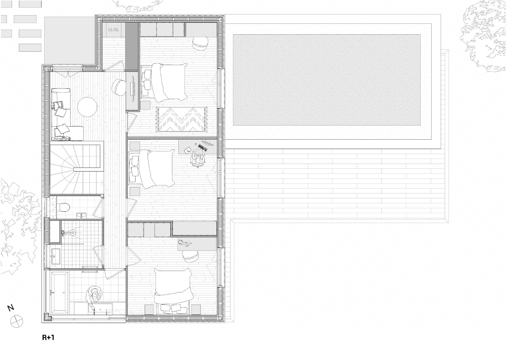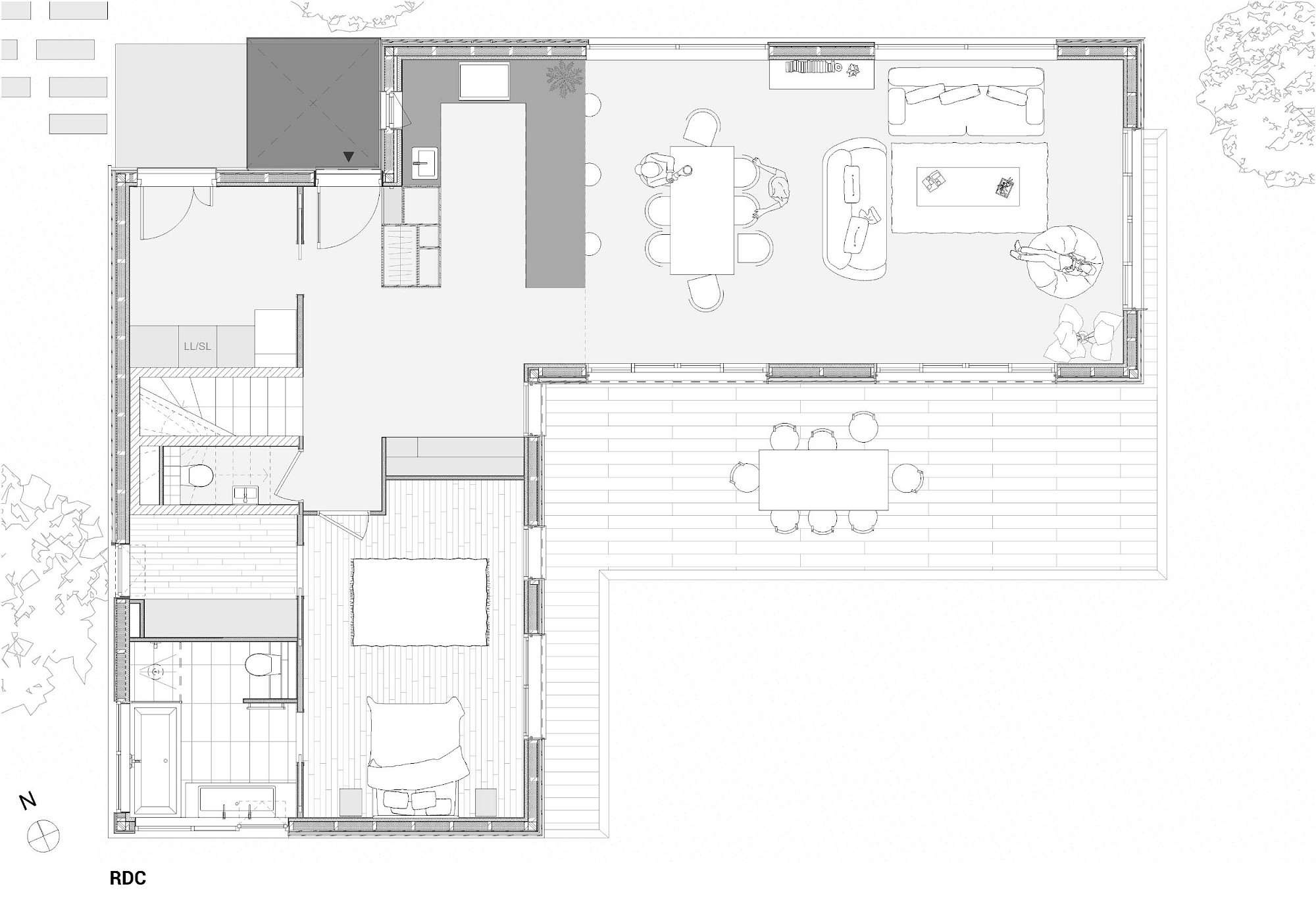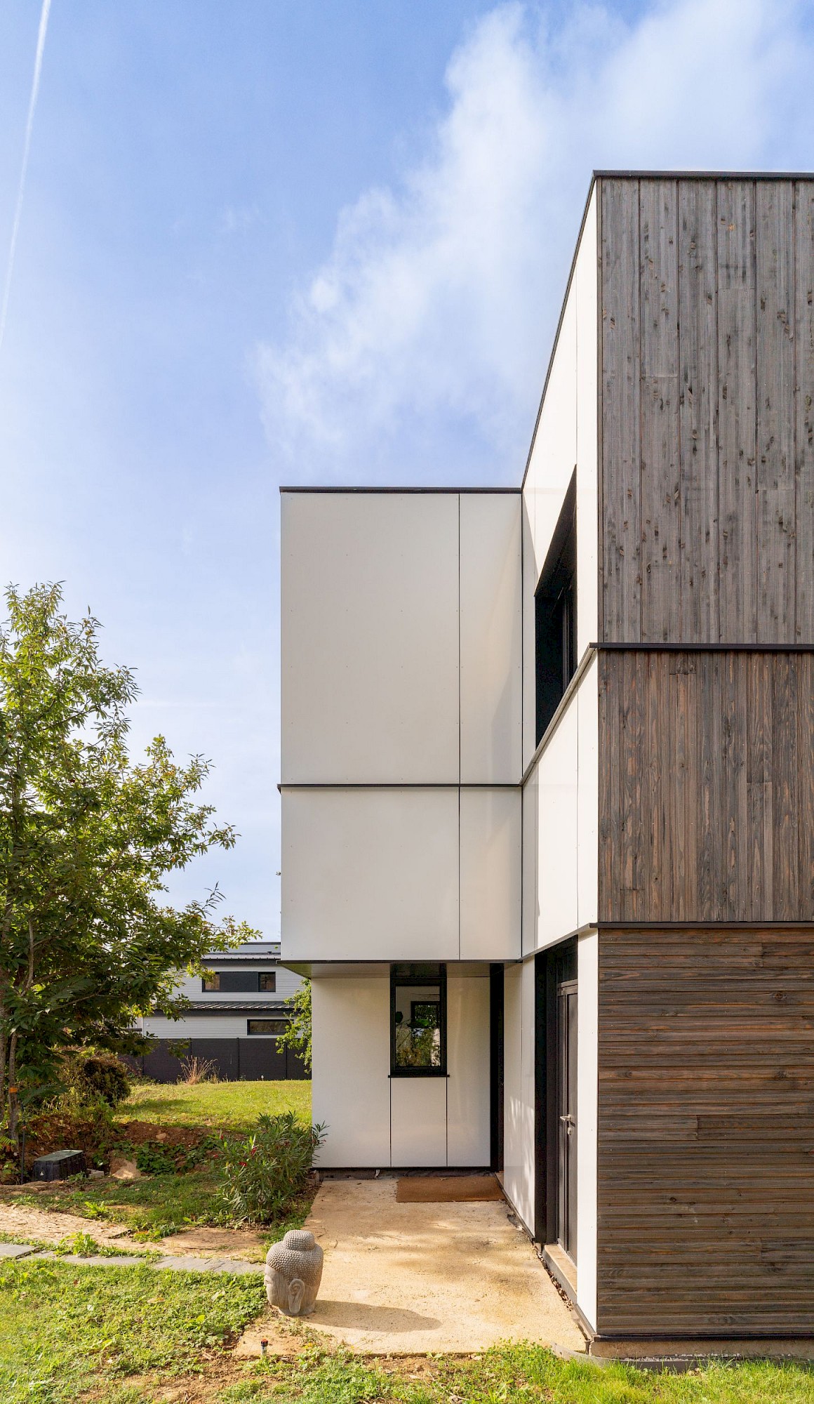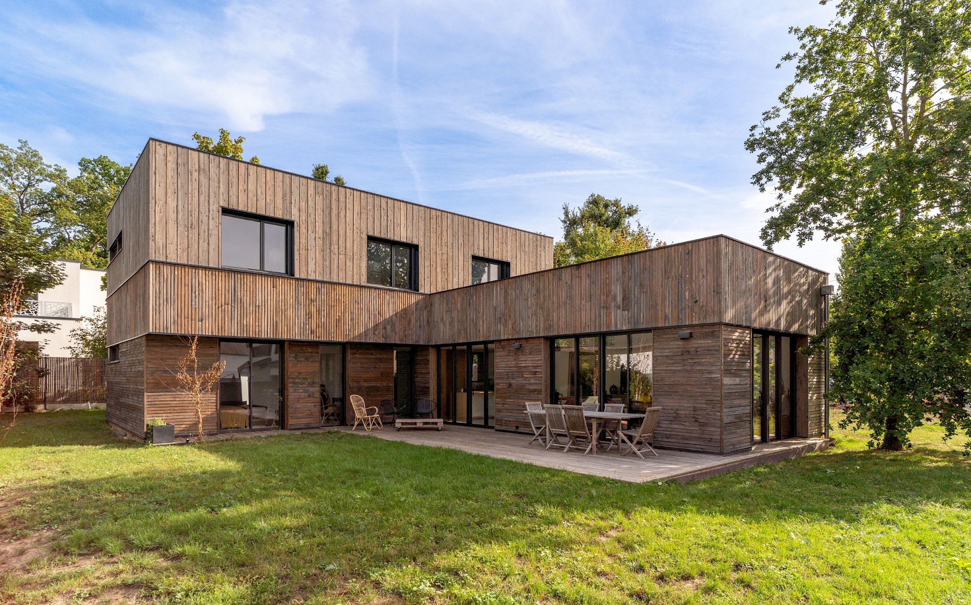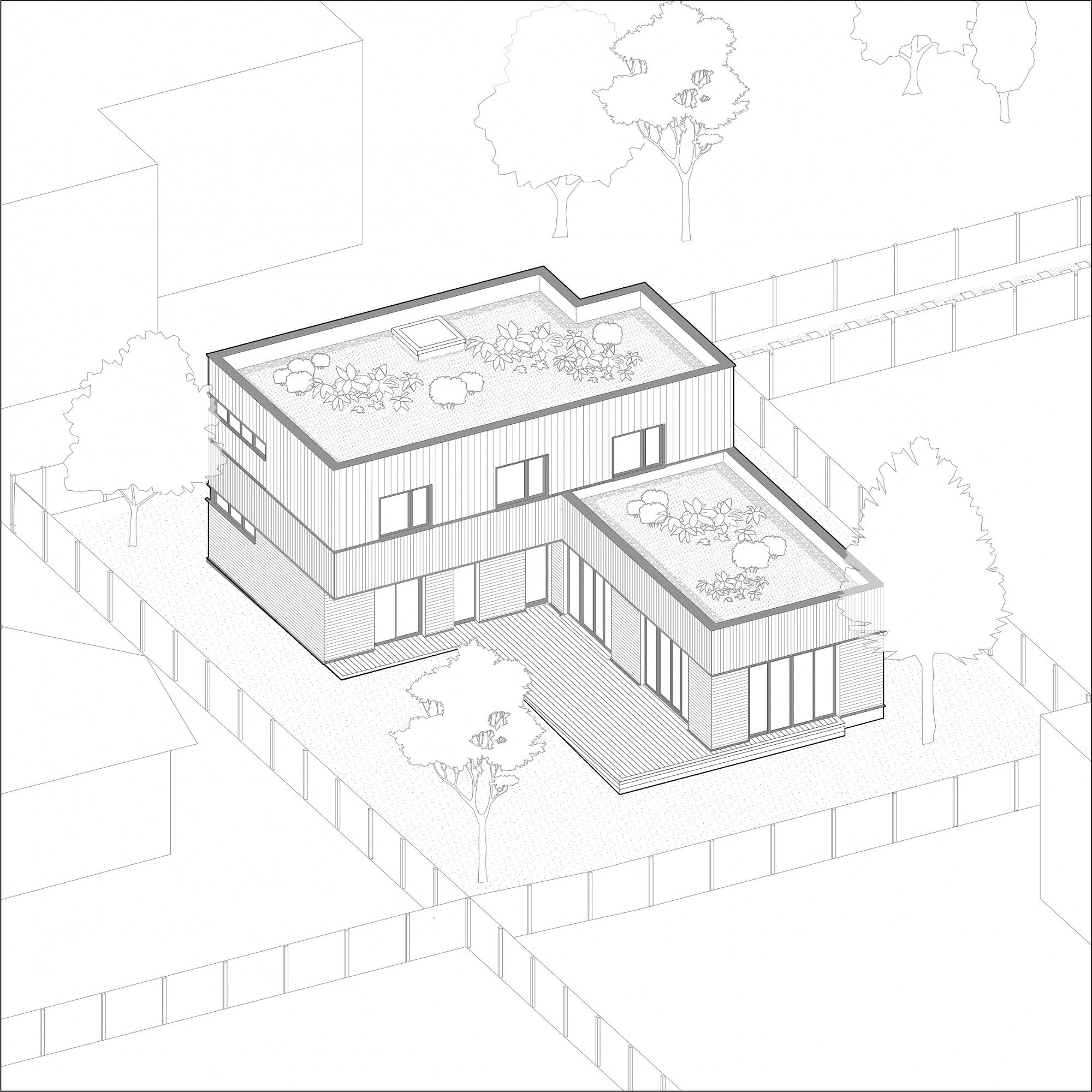 - À proposSur un terrain vierge de tous réseau, projet d’allotissement de deux terrains et construction d’une maison neuve en structure bois à toitures végétalisées, sur une dalle maçonnée. La nature argileuse des sols a impliqué une grande précaution dans la gestion des eaux pluviales pour limiter le phénomène de gonflement et de retrait du sol qui aurait pu mettre en péril les fondations de la maison..