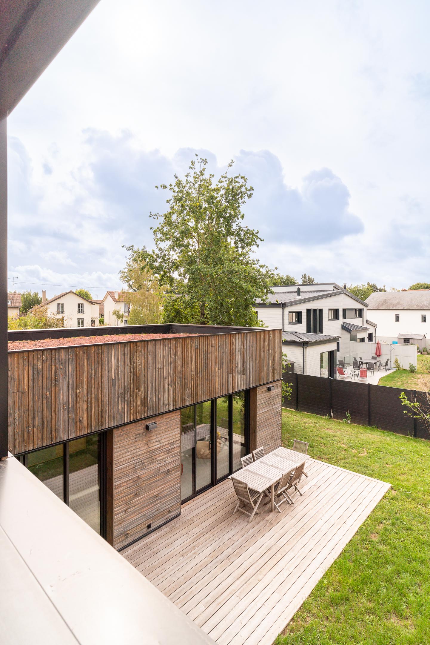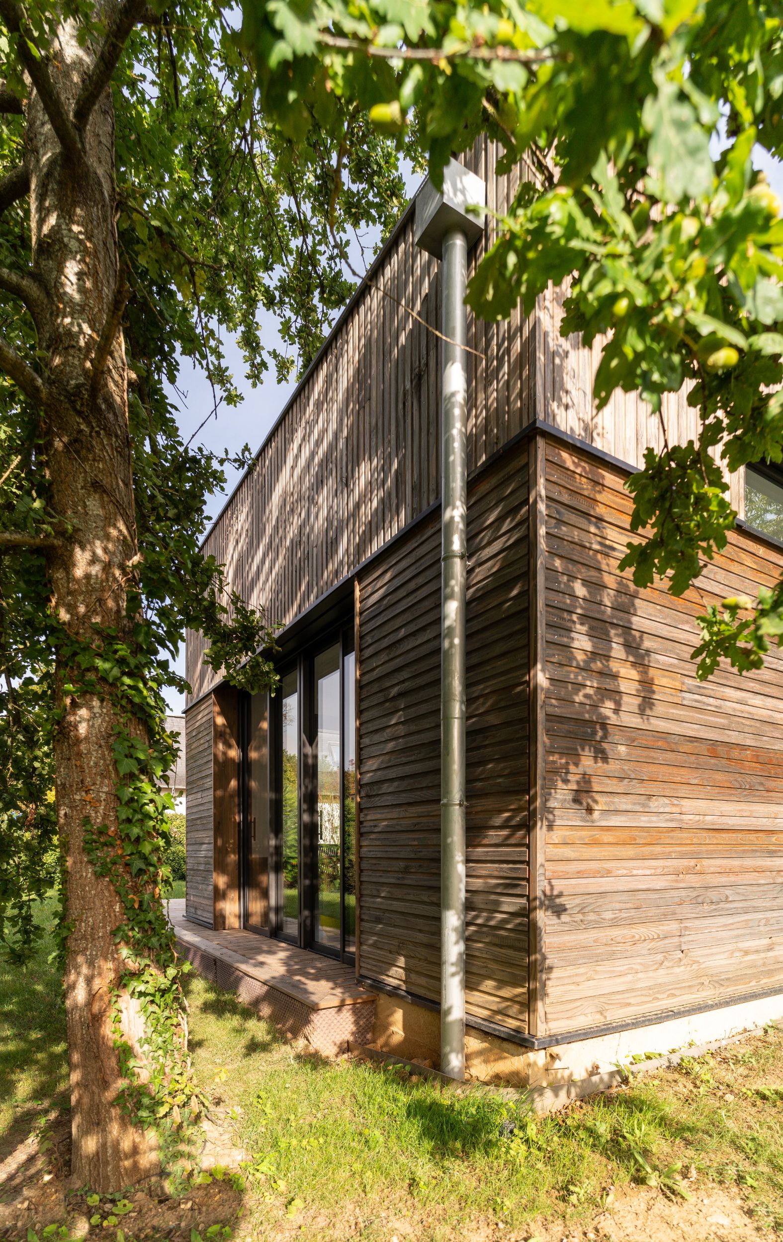 - À proposSur un terrain vierge de tous réseau, projet d’allotissement de deux terrains et construction d’une maison neuve en structure bois à toitures végétalisées, sur une dalle maçonnée. La nature argileuse des sols a impliqué une grande précaution dans la gestion des eaux pluviales pour limiter le phénomène de gonflement et de retrait du sol qui aurait pu mettre en péril les fondations de la maison..