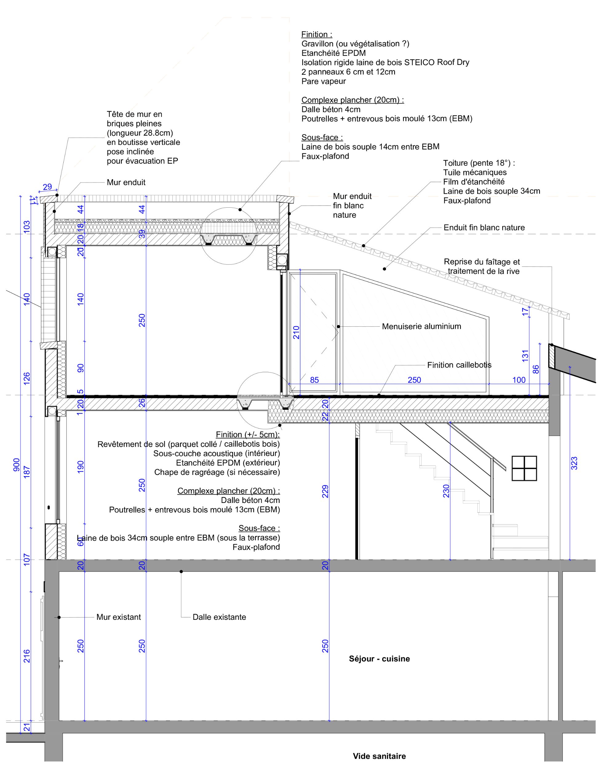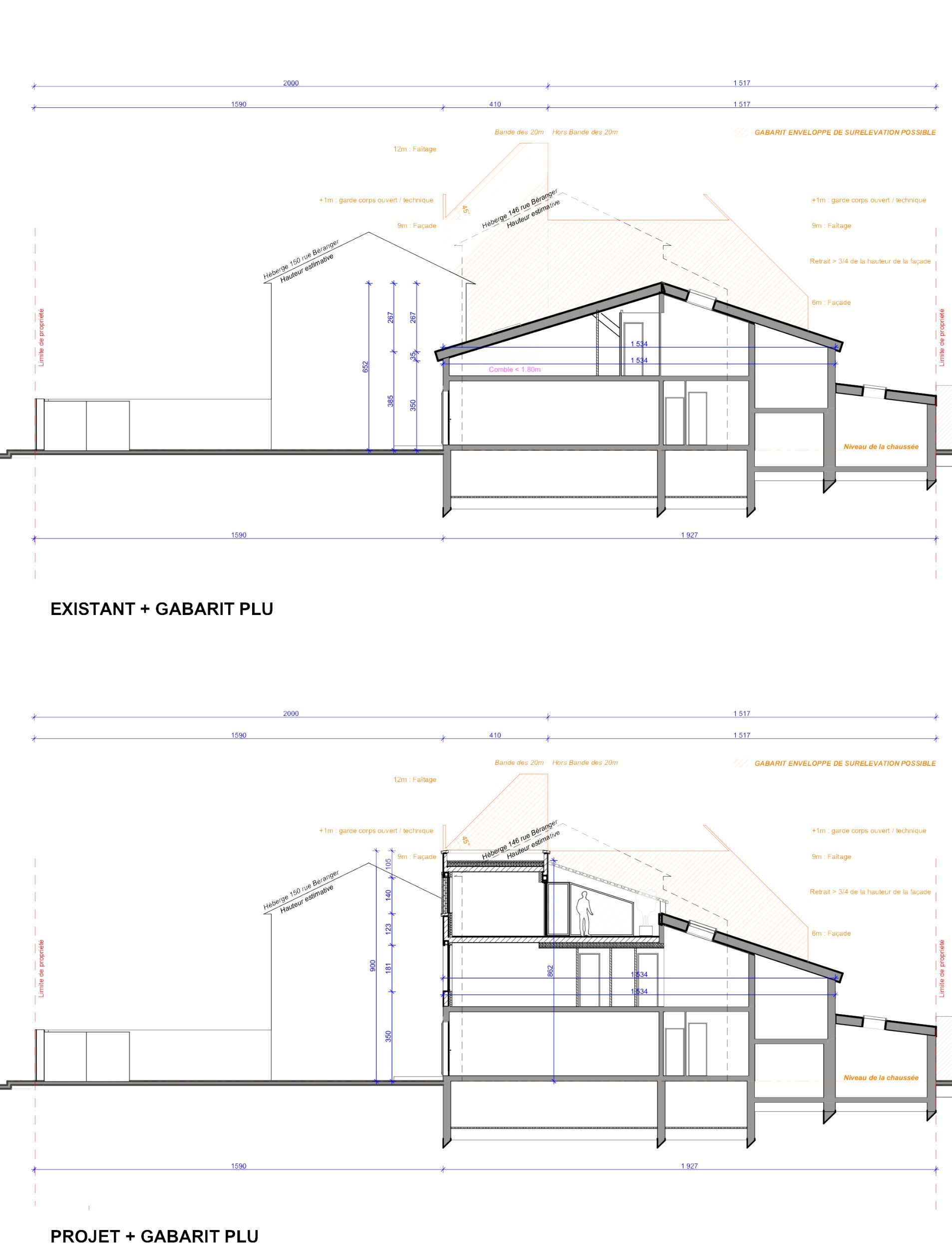 - À proposSurélévation d’une maison de ville afin d’agrandir le R+1 sous combles existant (réagencement), et création d’un R+2 comprenant une chambre et une terrasse tropézienne