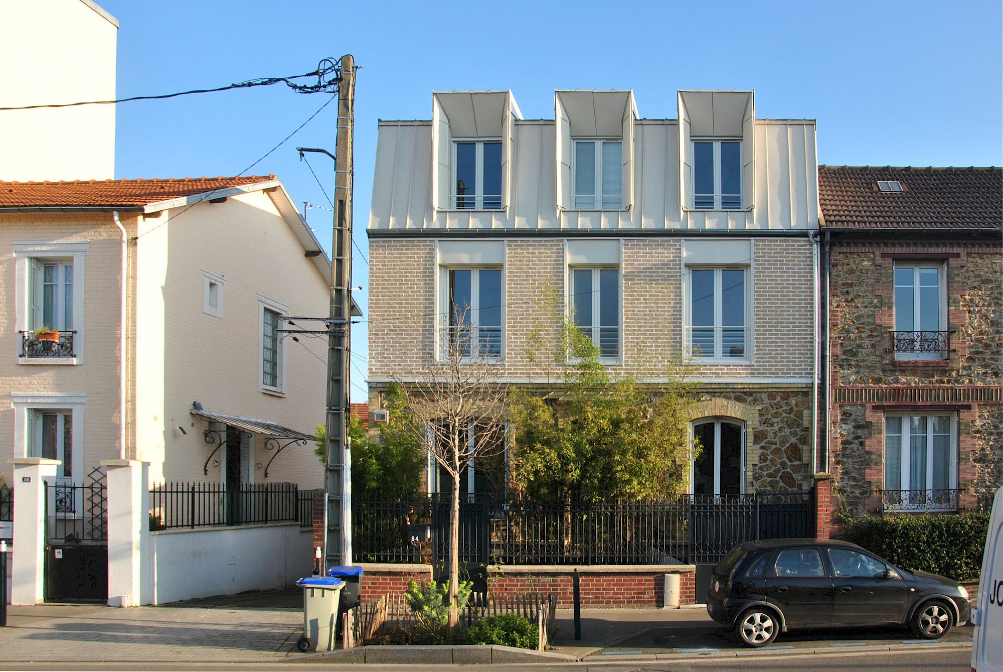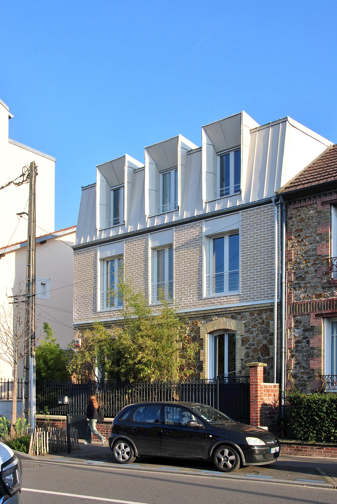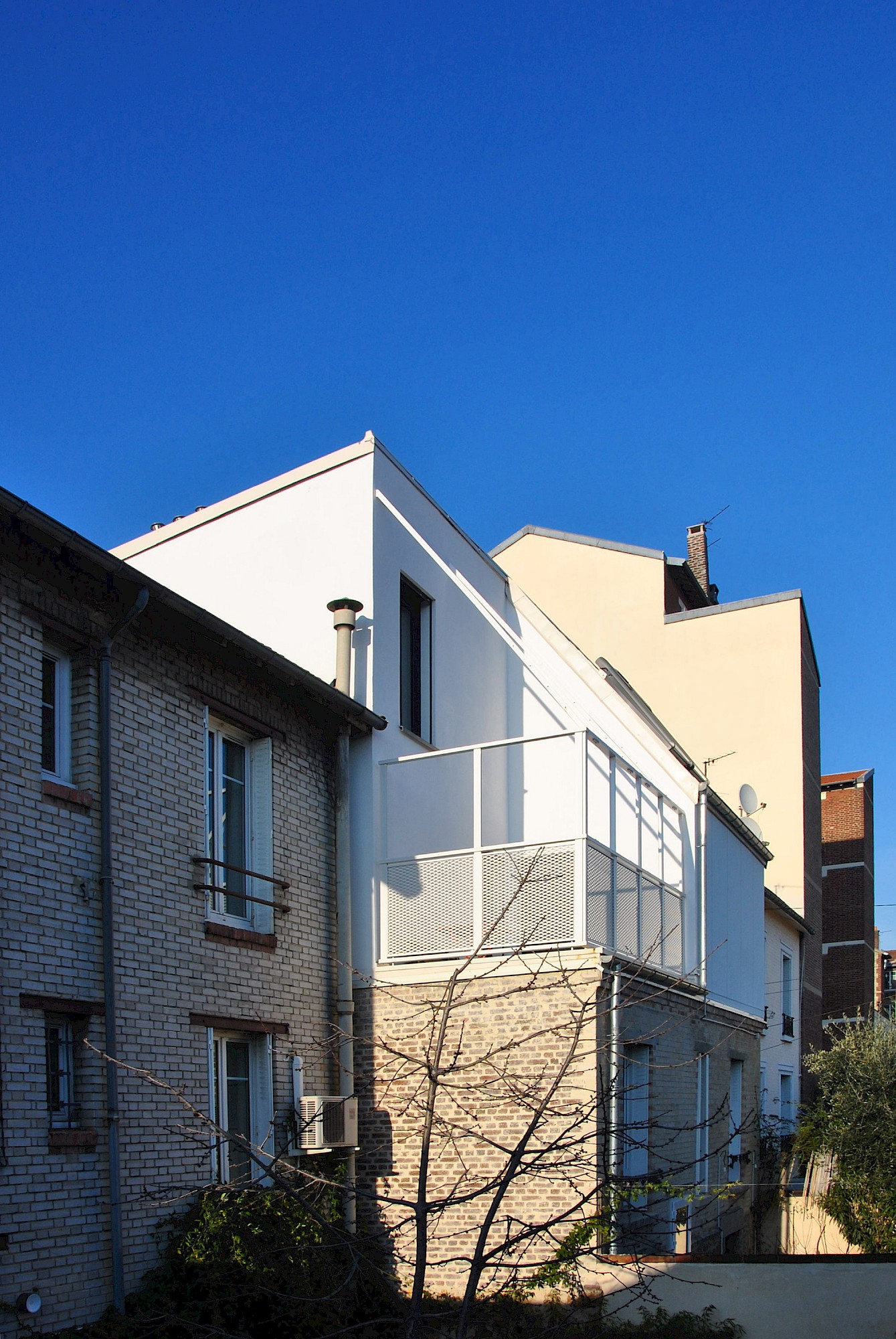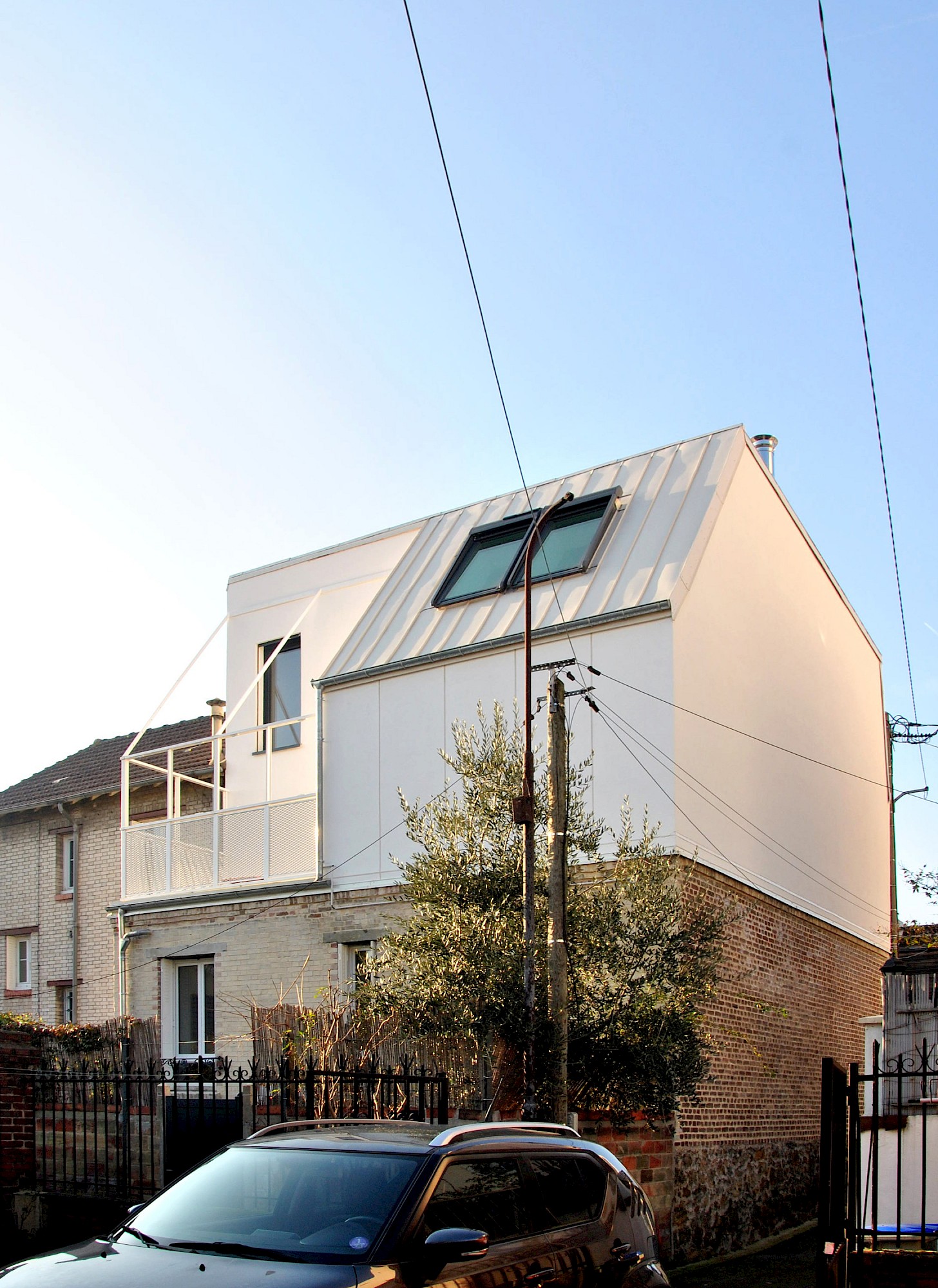 Le projet reprend les matérialités et alignements voisins. La dominance du blanc limite les contrastes visuels et l’effet d’ilot de chaleur urbain. L’arrière de la maison se joue des règles du PLU pour créer une volumétrie plus contemporaine et une terrasse au soleil (avec une ossature pour plantes grimpantes).