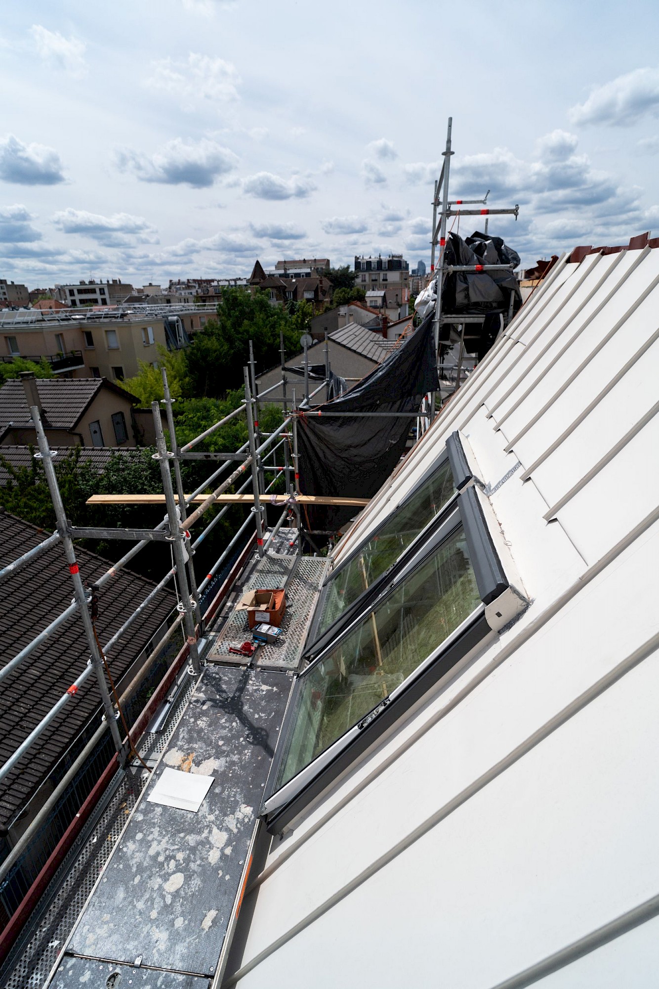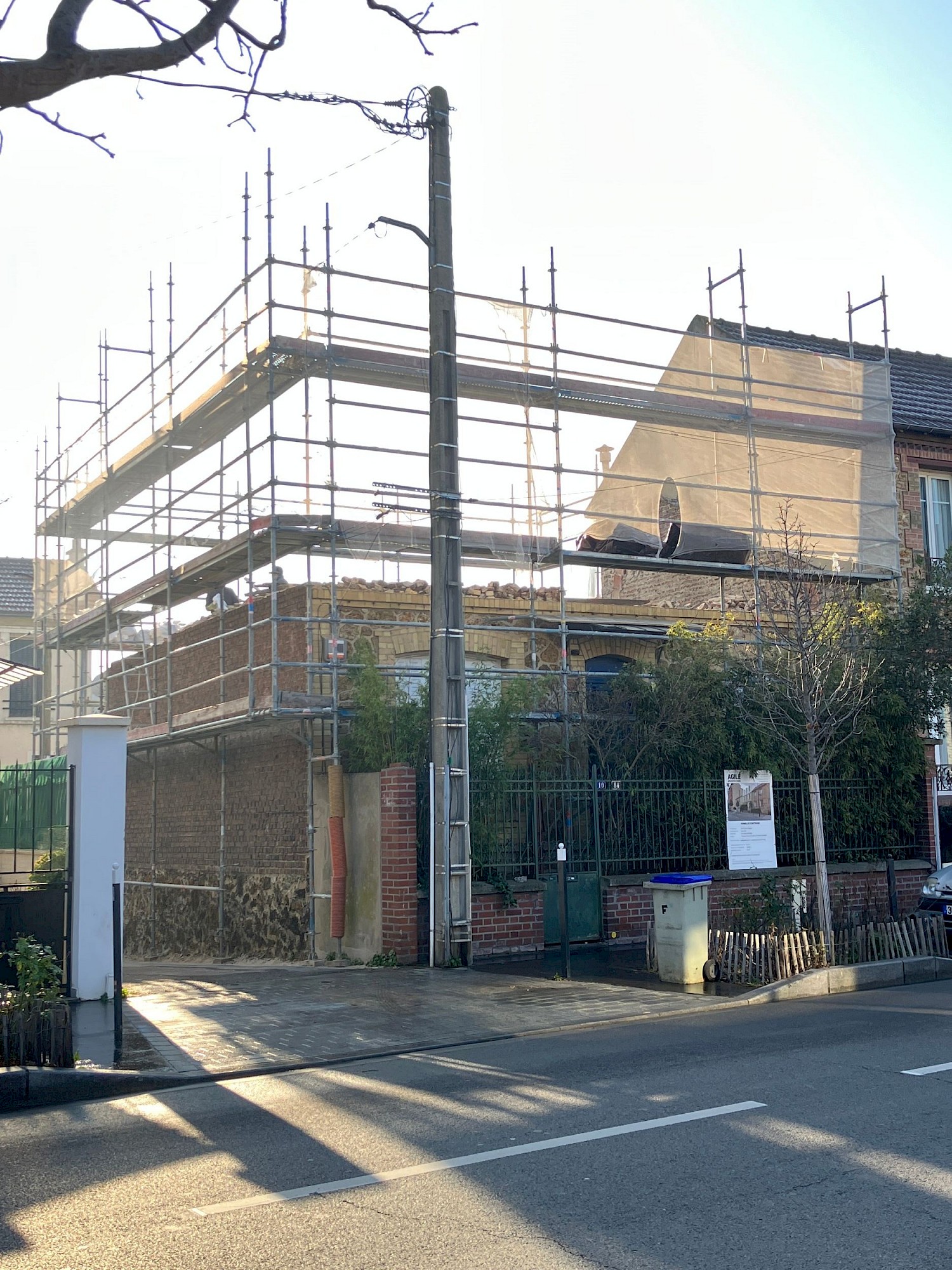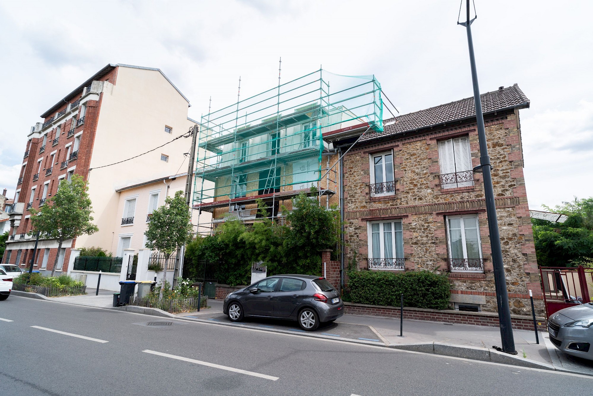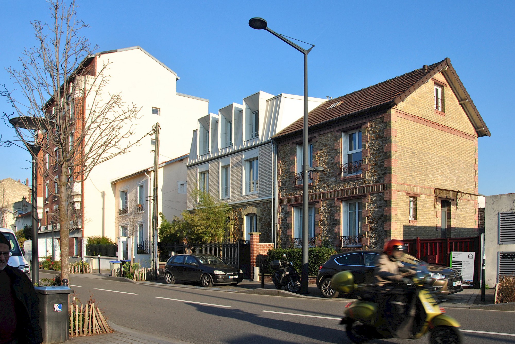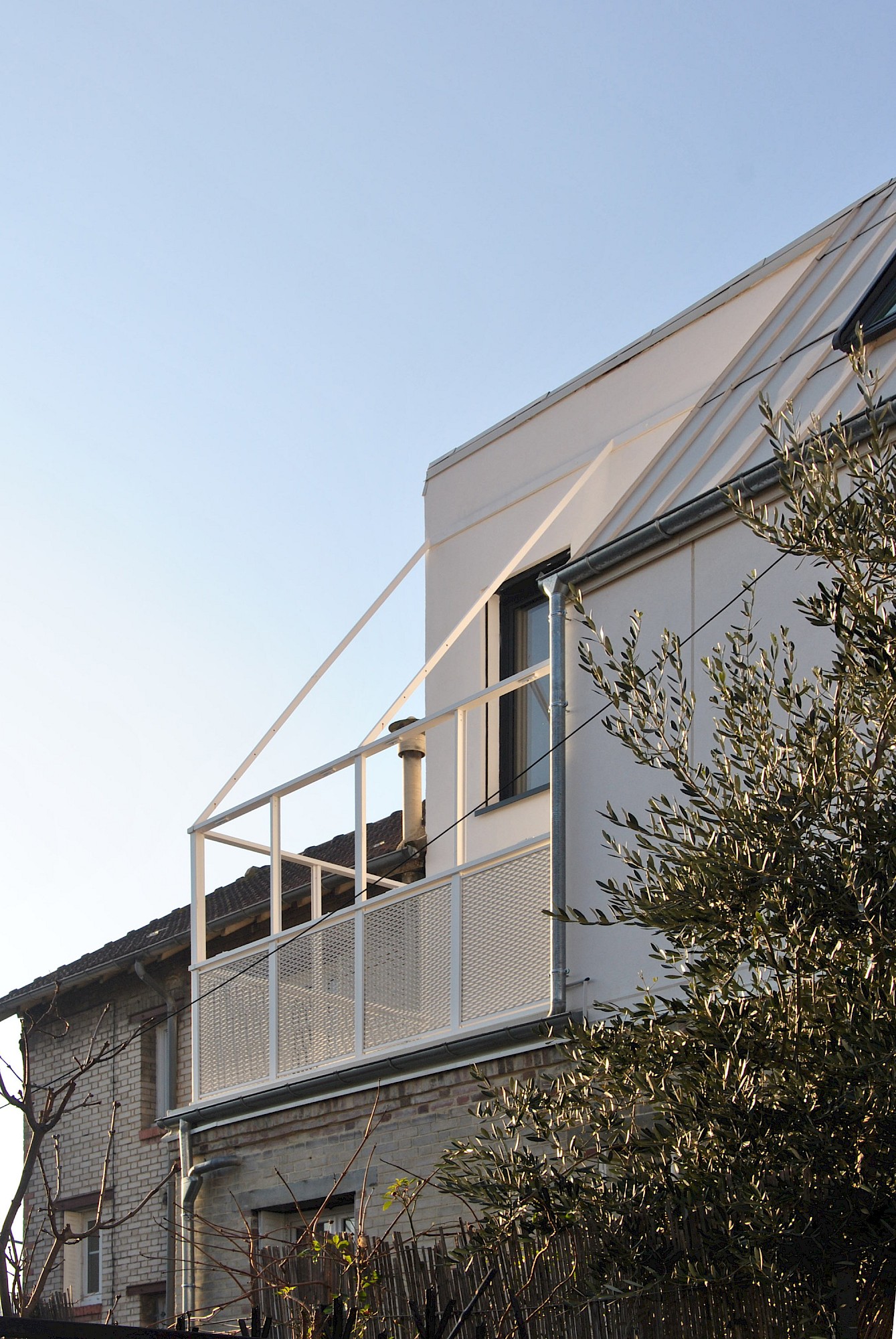Le projet reprend les matérialités et alignements voisins. La dominance du blanc limite les contrastes visuels et l’effet d’ilot de chaleur urbain. L’arrière de la maison se joue des règles du PLU pour créer une volumétrie plus contemporaine et une terrasse au soleil (avec une ossature pour plantes grimpantes).