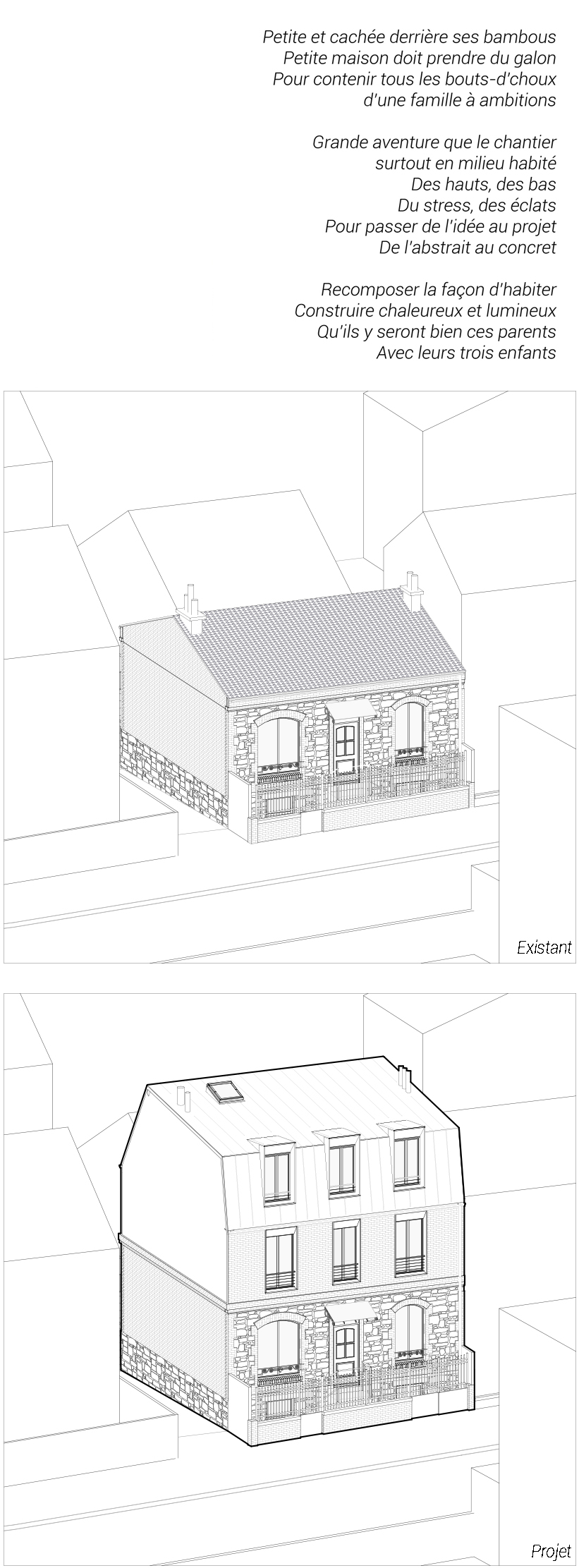 À l’instar de la famille, la maison doit s’agrandir. Le projet la surélève sur deux niveaux de plus. La maison étant de facture modeste et dans un contexte dense, le bois s’impose pour sa légèreté et facilité de mise en œuvre.