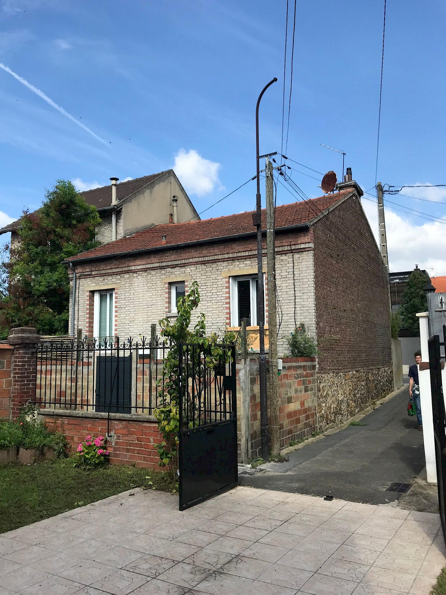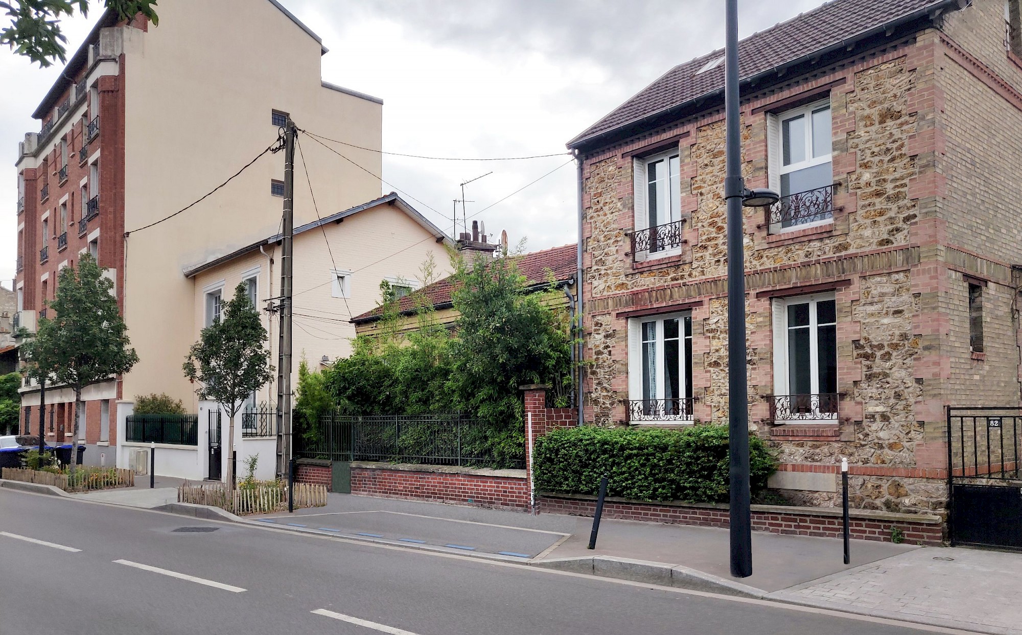 Dans un contexte urbain, une maison en brique et meulière (début XX) cachée par des bambous, comptait deux niveaux : un rez-de-chaussée habitable et une cave en rez-de-jardin.