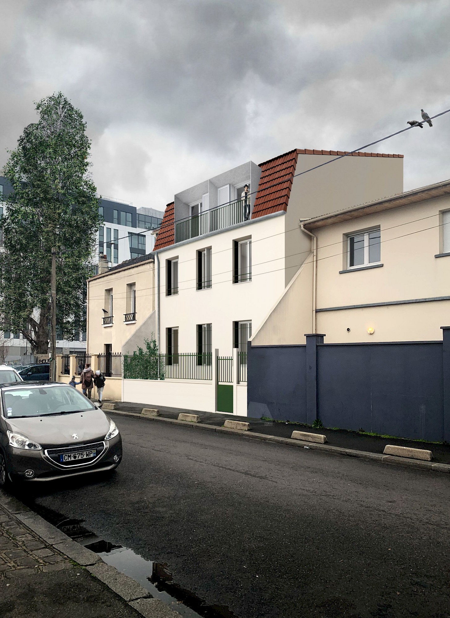 - À proposSurélévation, extension et rénovation intégrale d’une maison de ville pour la création de six studios. Construction en blocs de béton de chanvre, charpente bois, isolation biosourcée.