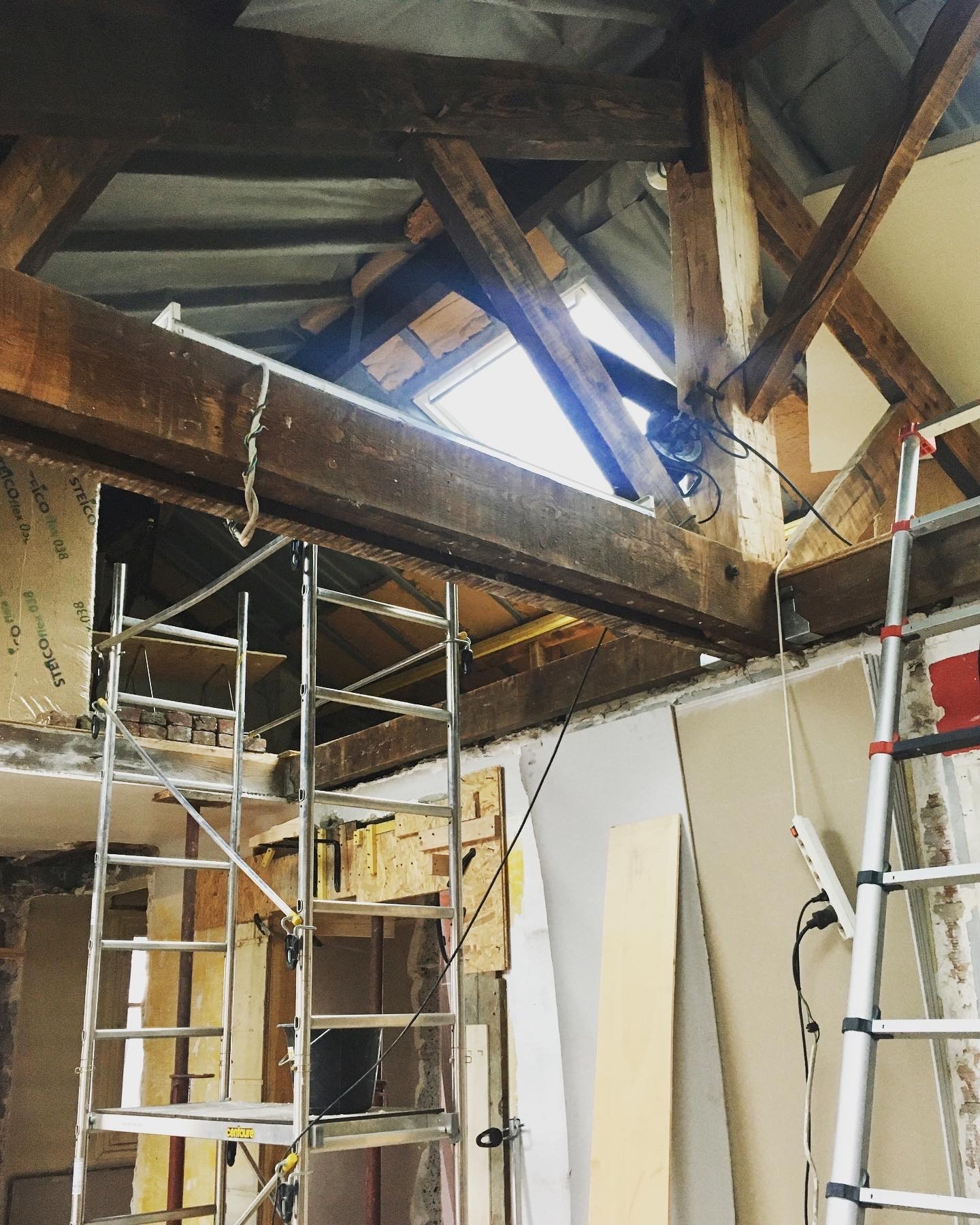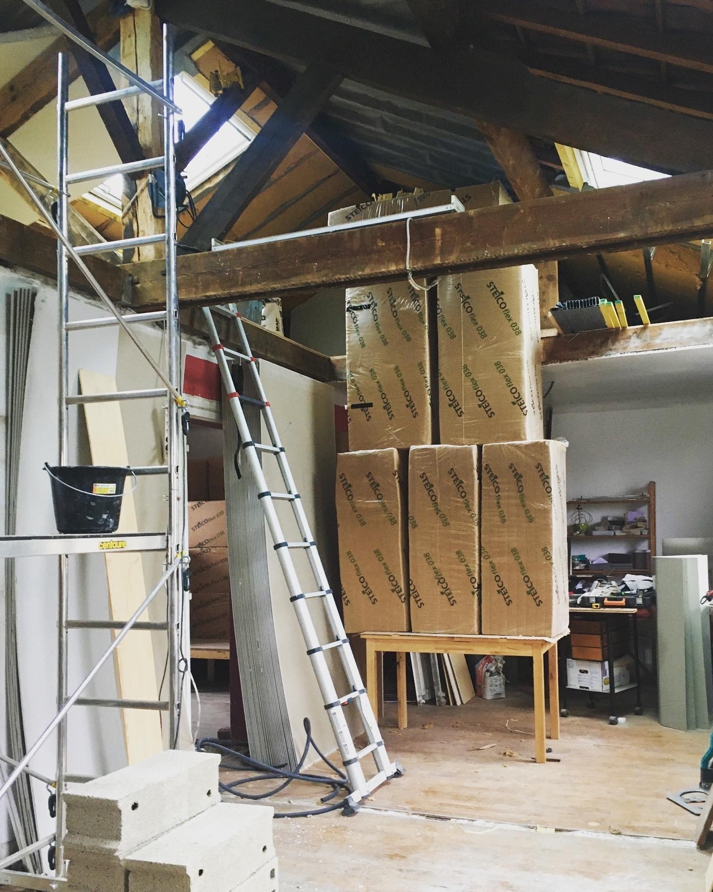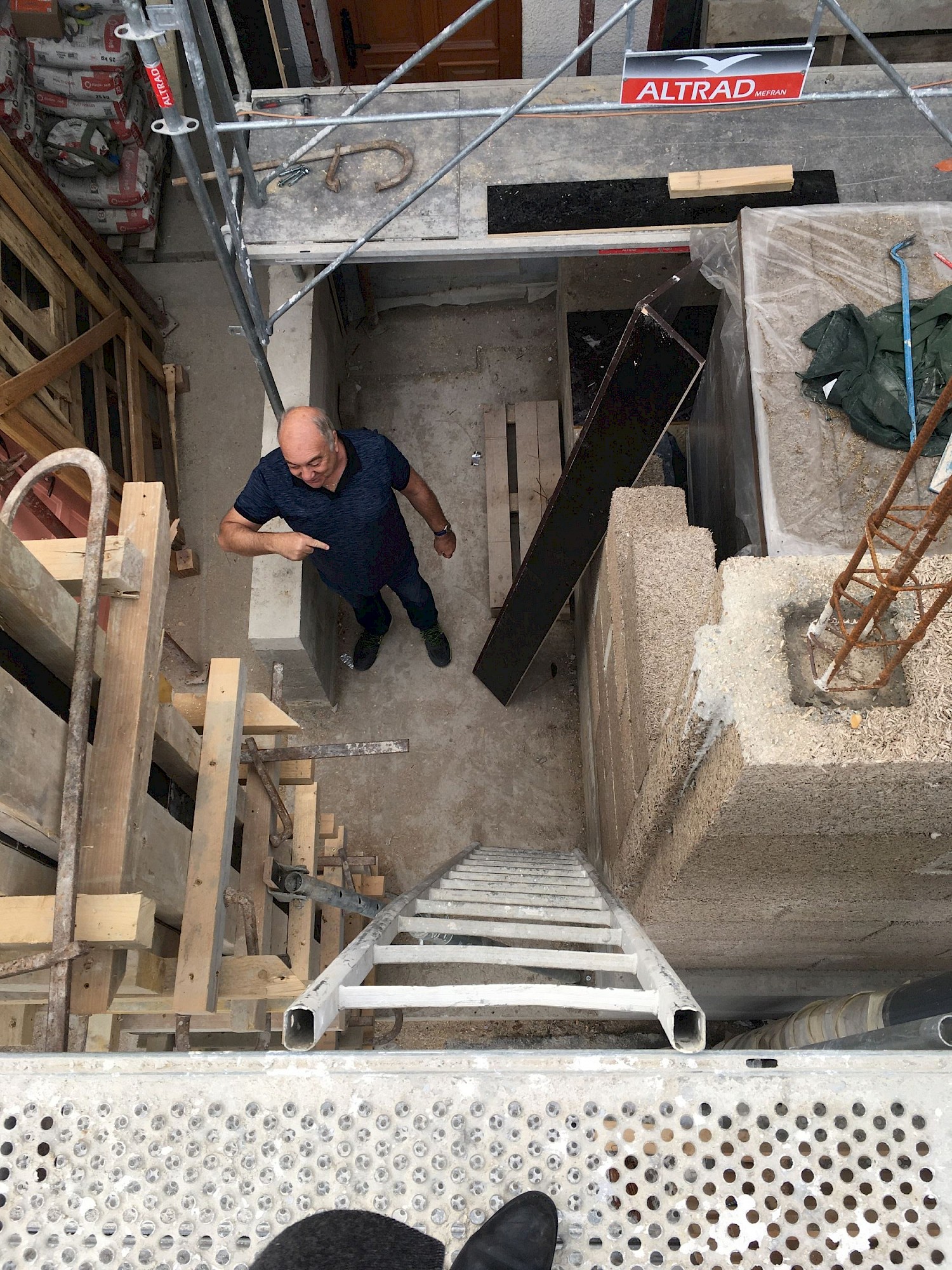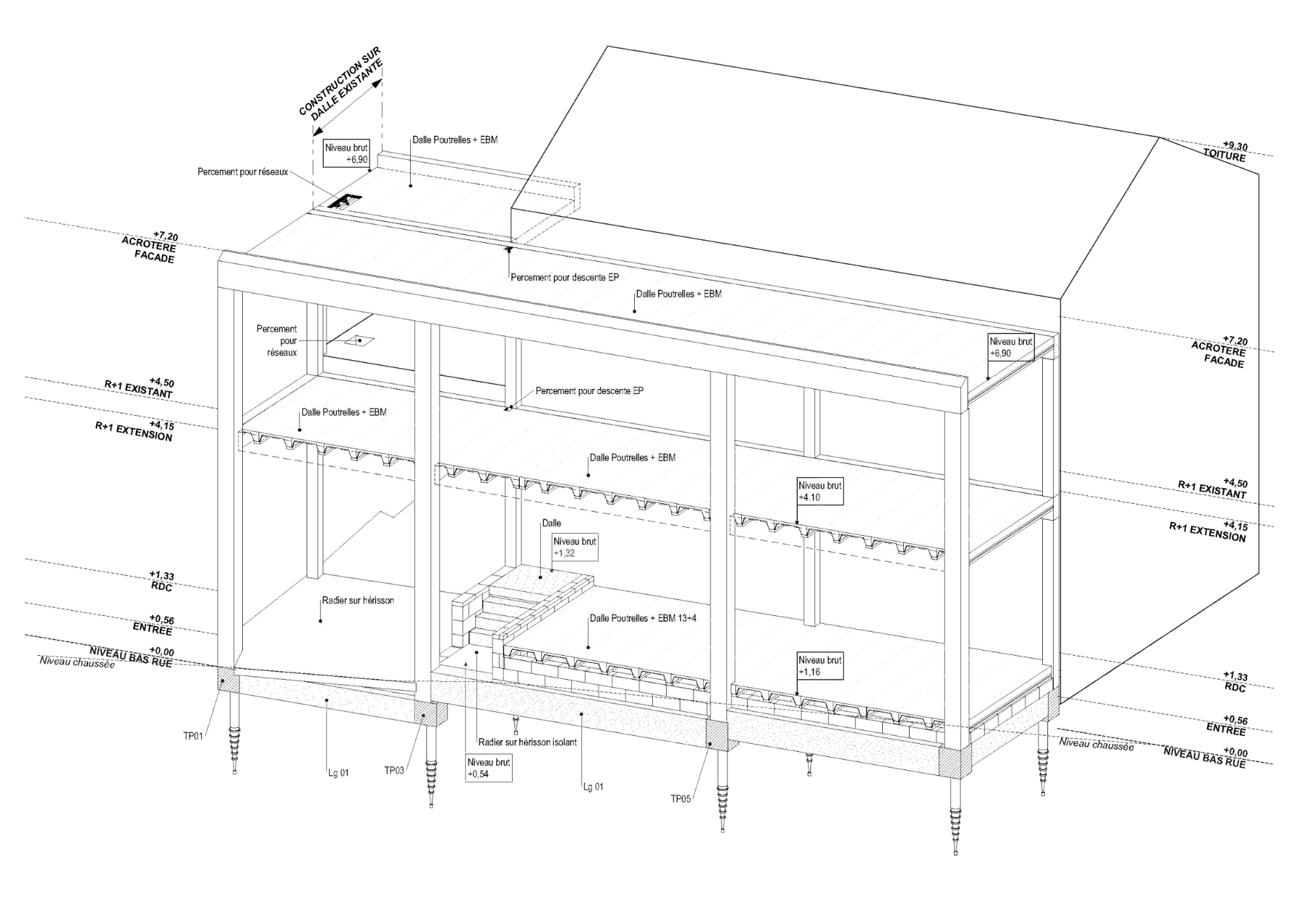 - À proposAgrandissement d’une maison pour créer 2 logements, des ateliers, et une grande toiture terrasse avec vue sur le grand paysage de Seine-Saint-Denis. Construction en béton de chanvre sur terrain argileux. Vis de fondations, planchers poutrelle et entrevous bois-moulé, isolations biosourcées, chauffage par poêle à bois central. Chantier en milieu occupé. Travaux intérieurs en auto-construction par la maitrise d’ouvrage.