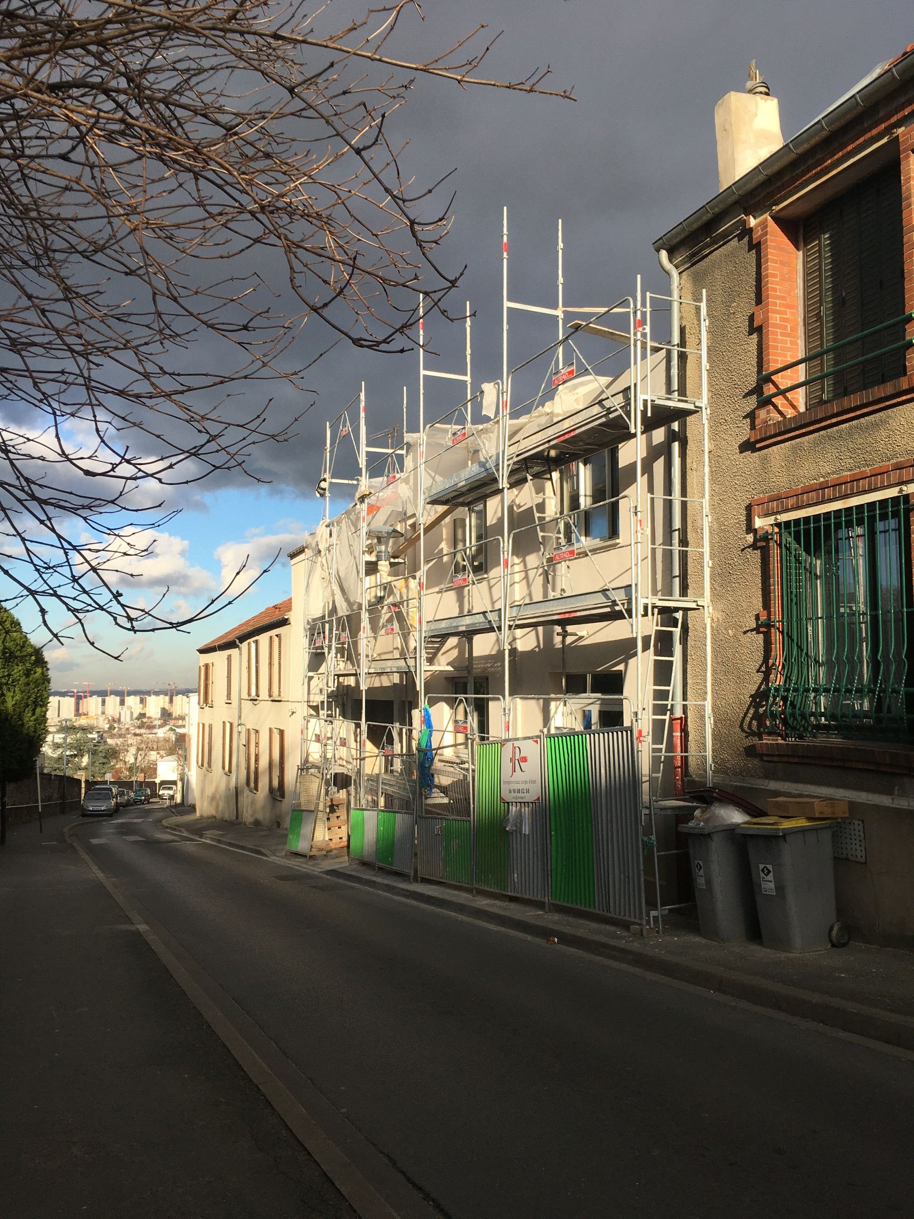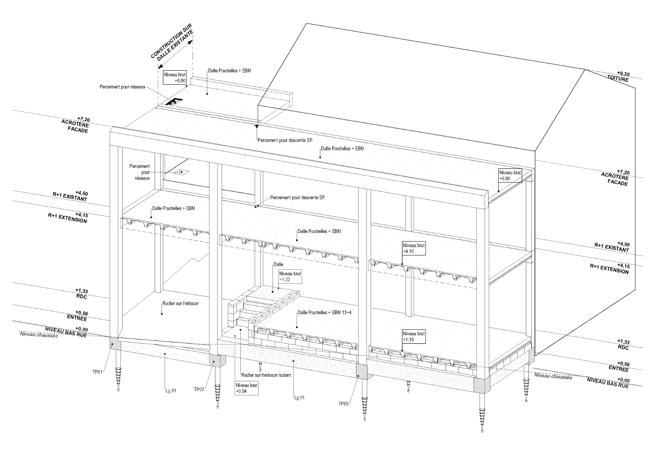 - À proposAgrandissement d’une maison pour créer 2 logements, des ateliers, et une grande toiture terrasse avec vue sur le grand paysage de Seine-Saint-Denis. Construction en béton de chanvre sur terrain argileux. Vis de fondations, planchers poutrelle et entrevous bois-moulé, isolations biosourcées, chauffage par poêle à bois central. Chantier en milieu occupé. Travaux intérieurs en auto-construction par la maitrise d’ouvrage.