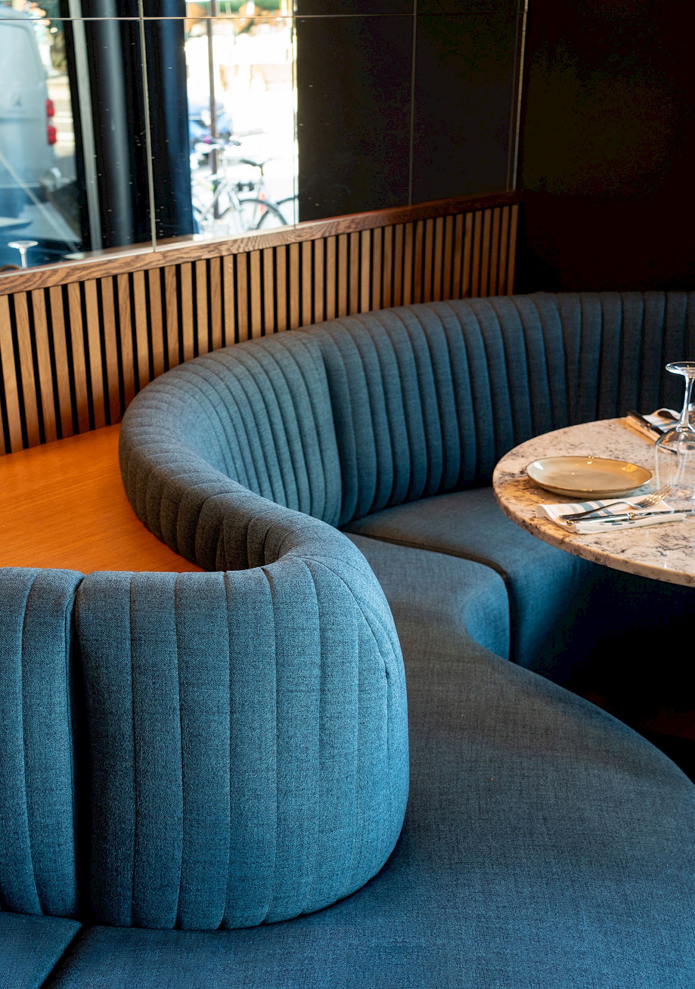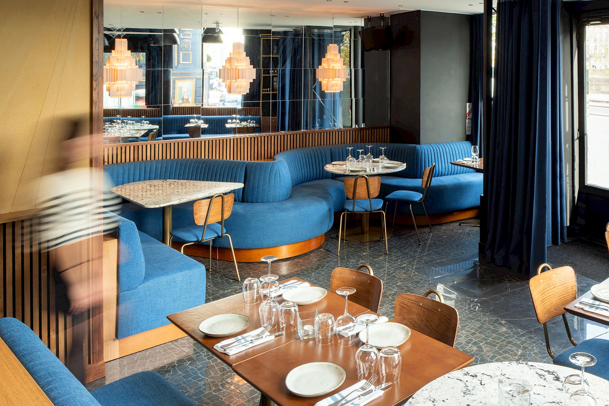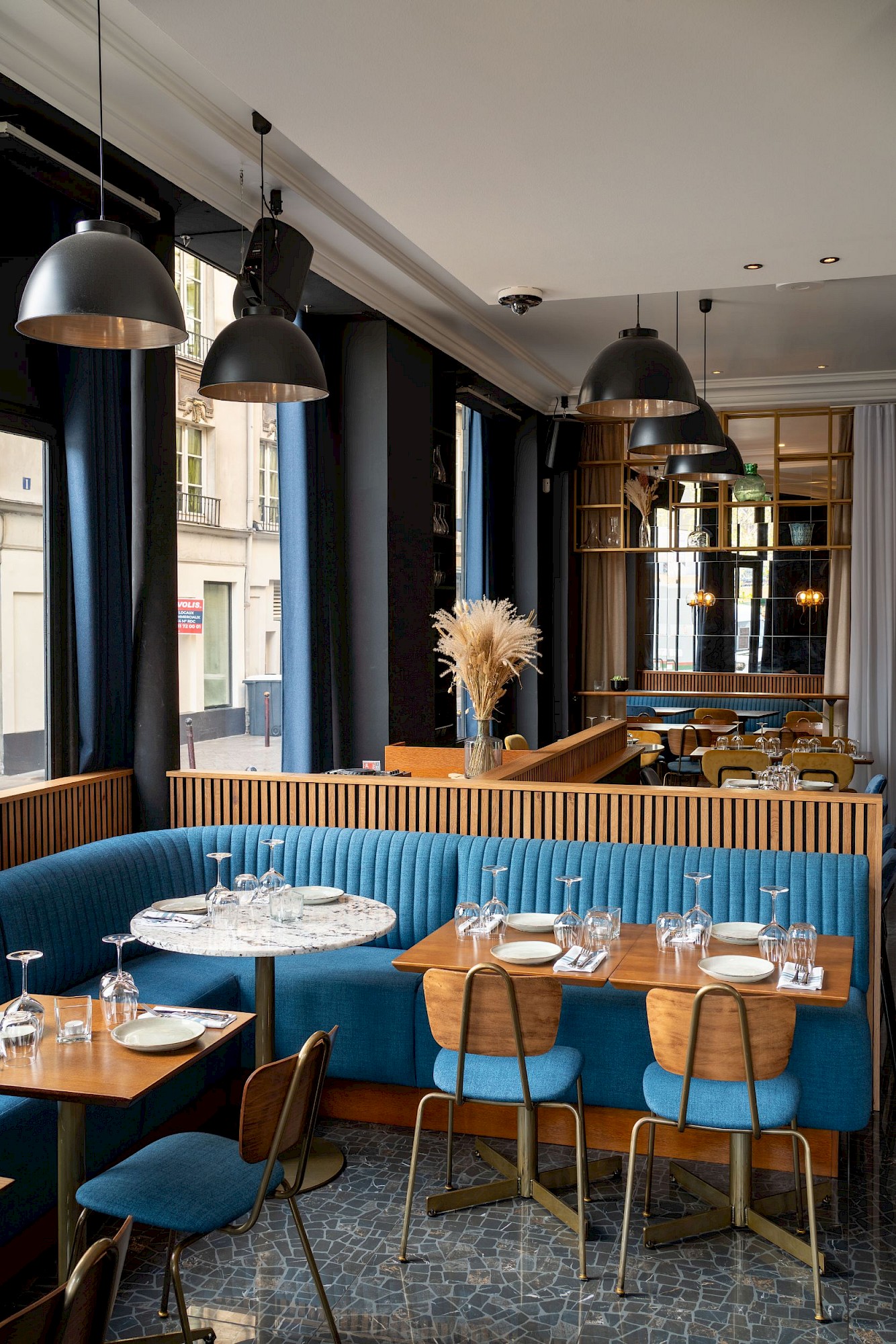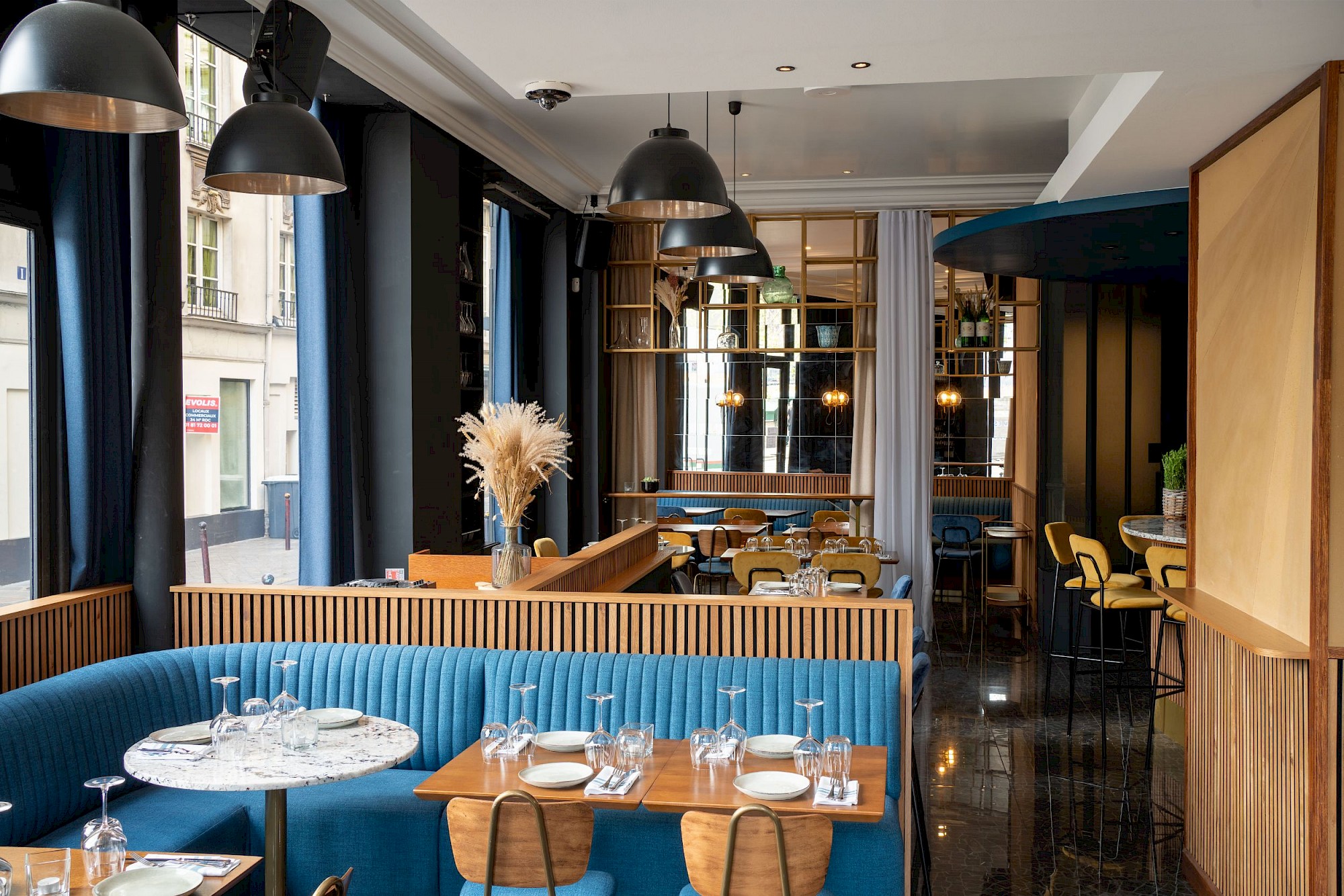 - À proposRénovation d’un restaurant avec agencement sur mesure : Création de serrurerie, menuiserie, tapisserie, tables, banquettes et bar sur mesure. Réemploi de banquettes, tables et chaises existantes (modifiées, rénovées, retapissées). Revêtements muraux enduits de terre du Grand Paris. Lampes en papier réalisées à la main par Antoine Becognée.