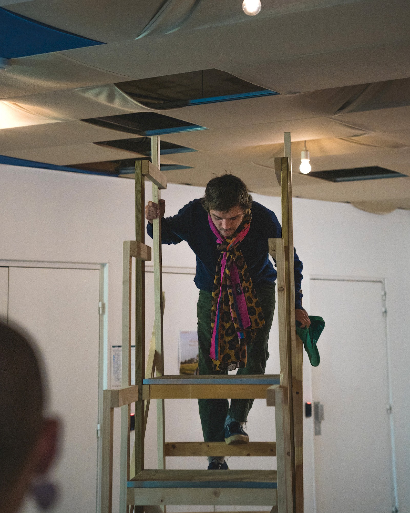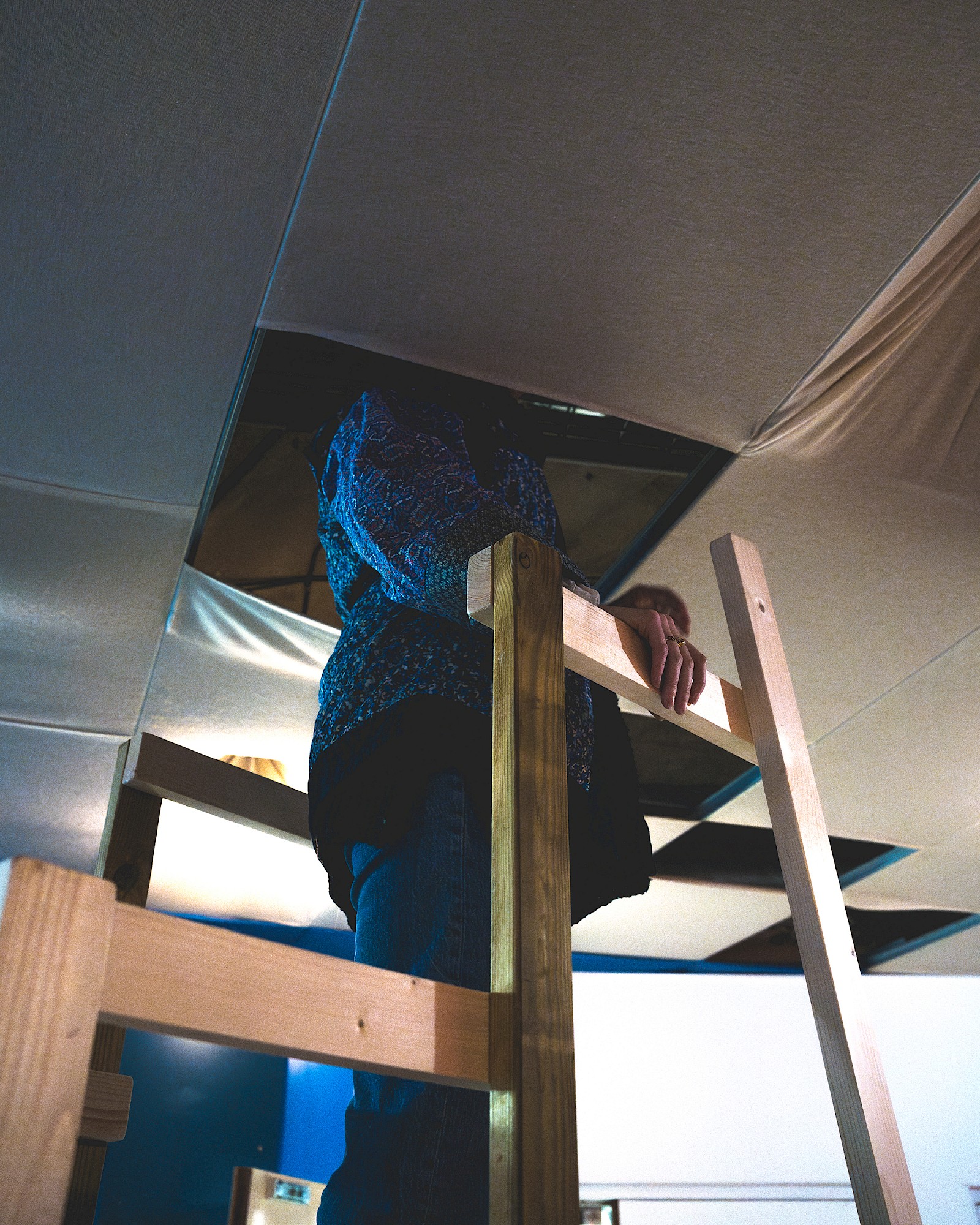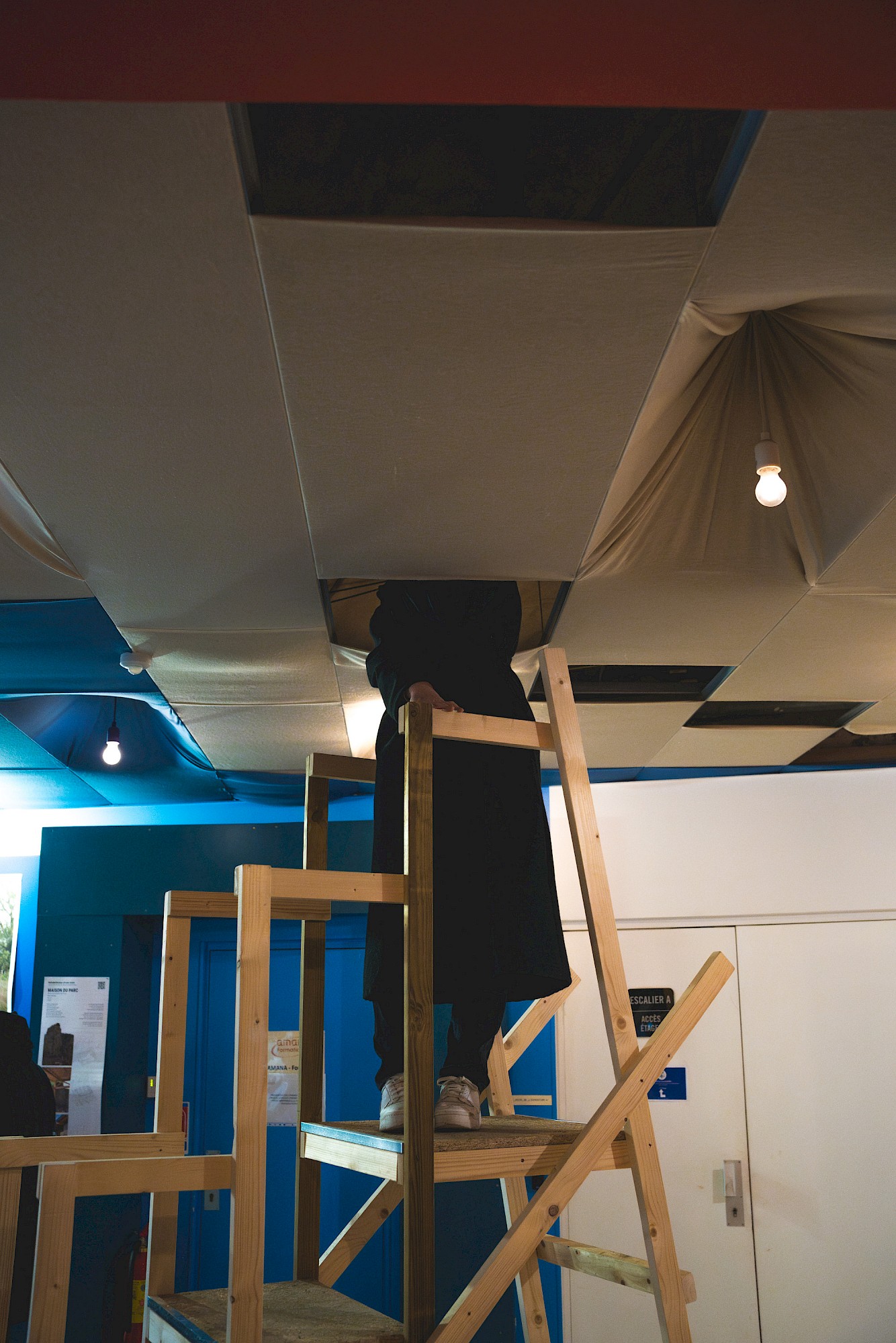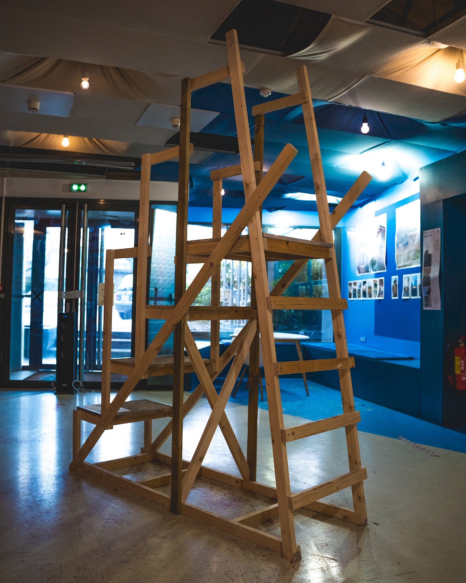 - À proposUn escabeau en bois pour s’élever (bois neufs et sauvés de la benne, cornières métalliques). La découverte d’un monde secret. Une ambiance sonore de gens contents de leur nouveau chez-eux.