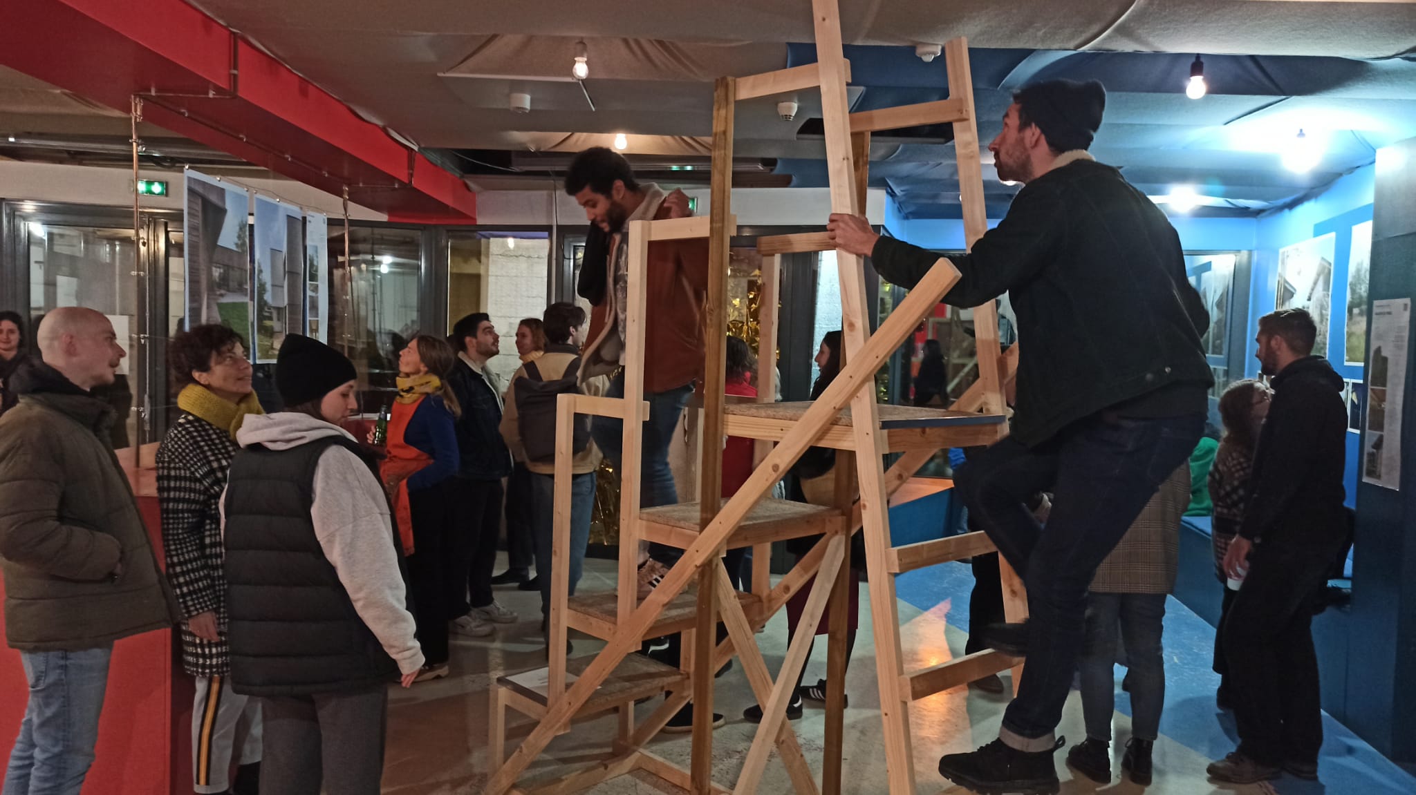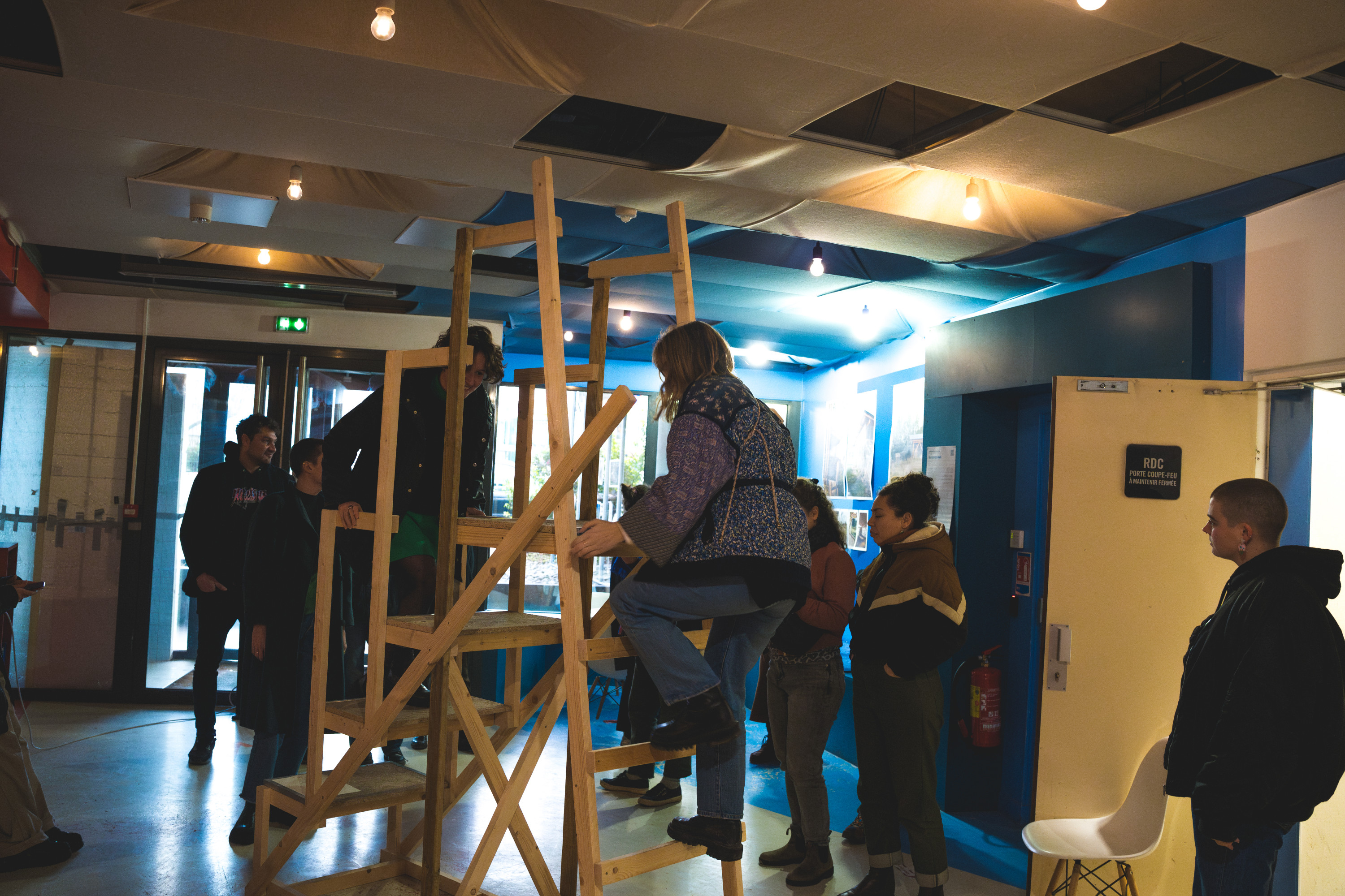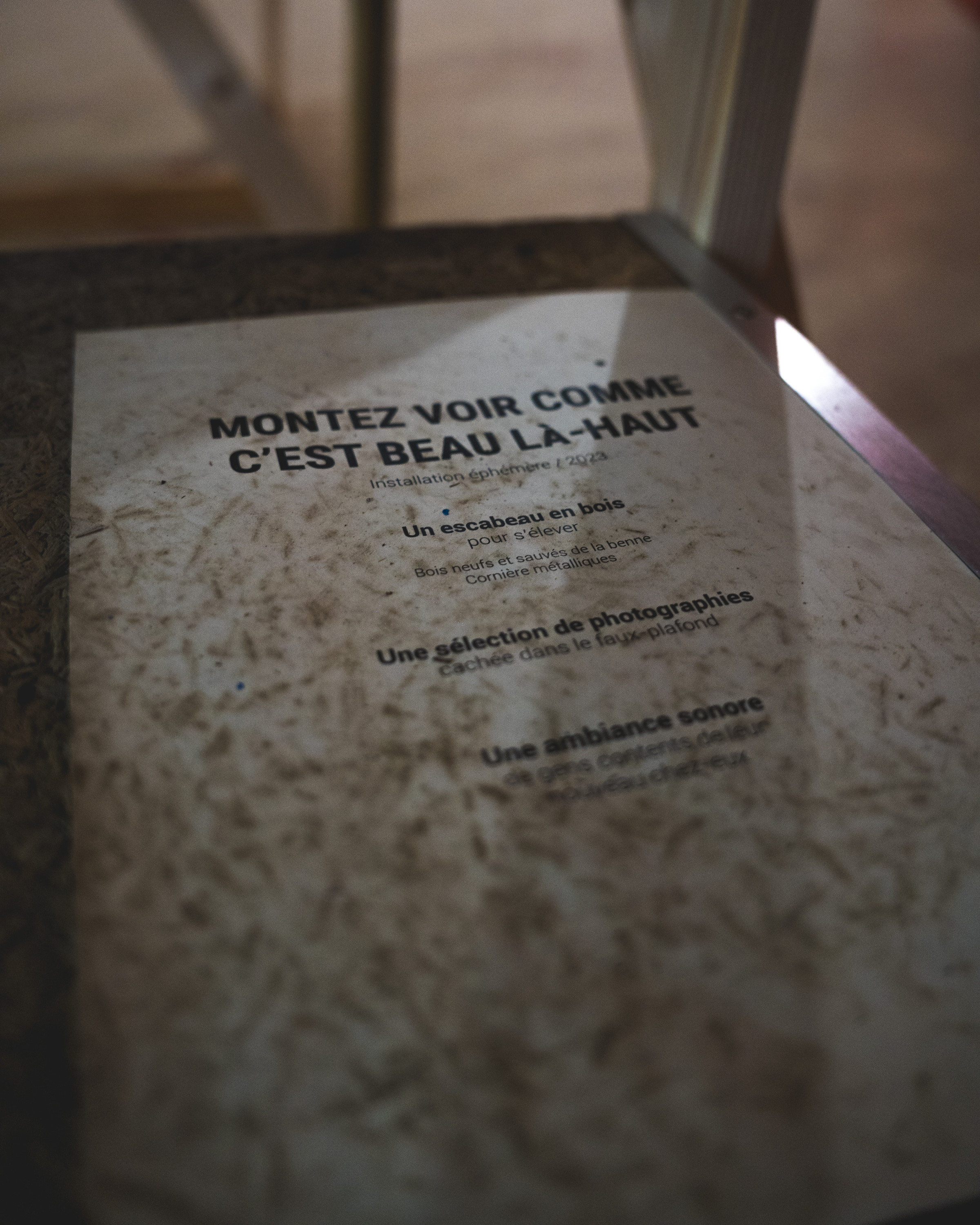 - À proposUn escabeau en bois pour s’élever (bois neufs et sauvés de la benne, cornières métalliques). La découverte d’un monde secret. Une ambiance sonore de gens contents de leur nouveau chez-eux.